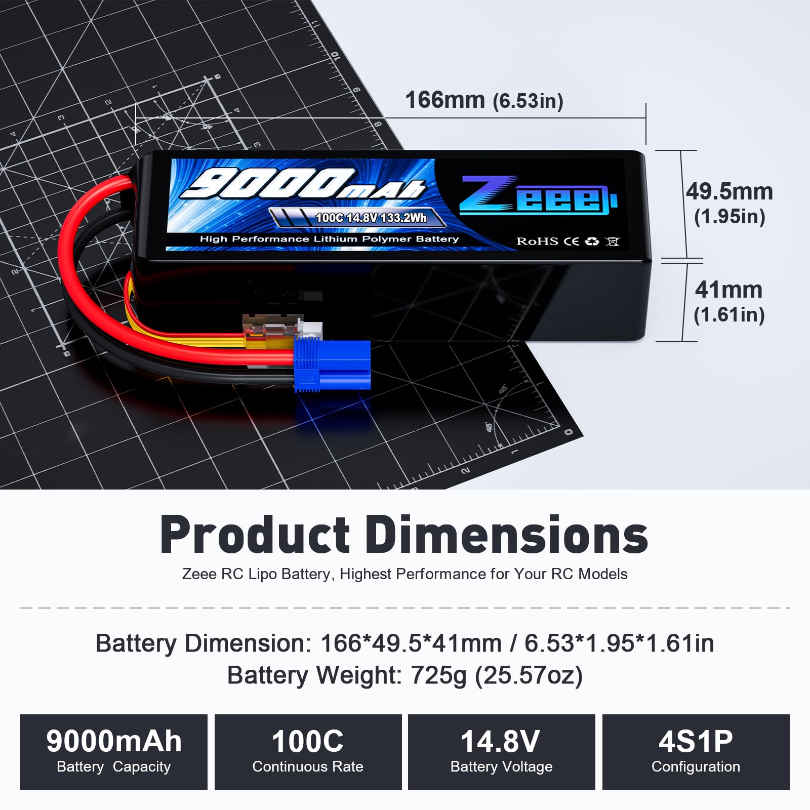 Zeee is a professional brand specializing in the research, development, production and sales of Li-polymer rechargeable batteries. Features - Light weight, long cycle life, no memory-effect. - High power battery, high capacity provide your rc model more energy, more enjoyment. - High Discharge rate, make your rc vehicle work powerfully. Specification Brand: Zeee Cell Number: 4 Voltage(V): 14.8V Capacity(mAh): 9000mAh Discharge Rate (C): 100C Charge Plug Type: JST-XH Discharge Plug Type: EC5 Plug Battery Dimension: 166*49.5*41mm/6.53*1.95*1.61inch Approx Weight: 736g/25.96oz Compatible RC Models - Zeee 4S 9000mAh Lipo Battery compatible with professional RC car hobby models.(only if the voltage, weight, dimension and plug match) High Performance - Zeee 14.8V lipo battery 9000mah with 100C discharge rate offers you very high power and very long run time for your RC cars. - Zeee 14.8V 4S RC lipo battery 9000mAh provides your batteries very solid protection, it comes with an equipped EC5 plug. They are your ideal chooses for the RC car hobby. Package Including 2 Pack of Zeee 14.8V 100C 9000mAh RC Lipo Battery with EC5 plug Attention1) Lipo batteries are potentially hazardous. Improper usage can cause fire or explosion. 2) Charge only with a lithium polymer (LiPo) battery charger 3) Do not charge the battery to more than 4.2V per cell & Do not discharge below 3.2V per cell under load 4) If the new battery wont hold a full charge or loss the charge very quickly in a short time, please use Balance Charger to charge and recycle several times first.