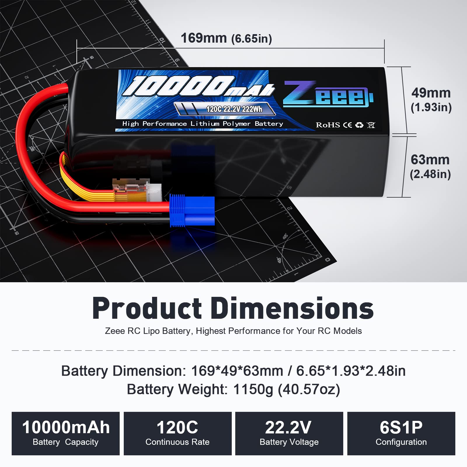 Zeee is a professional brand specializing in the research, development, production and sales of Li-polymer batteries. Features - Light weight, long cycle life, no memory-effect. - High power battery, high capacity provide your rc model more energy, more enjoyment. - High Discharge rate, make your rc vehicle work powerfully. Specification Brand: Zeee Cell Number: 6 Voltage(V): 22.2V Capacity(mAh): 10000mAh Discharge Rate (C): 120C Charge Plug Type: JST-XH Discharge Plug Type: EC5 Plug Battery Dimension: 169*49*63mm/6.65*1.93*2.48inch Approx Weight: 1150g/40.57oz Compatible RC Models - Zeee 6S 120C 10000mAh Lipo Battery compatible with Traxxas Unlimited Desert Racer, RC Car, Truck, RC Tank, Racing Models, etc. (only if the voltage, dimension and plug match, then it will fit for your models). High Performance - Zeee 22.2V lipo battery 10000mAh with 120C discharge rate offers you very high power and very long run time for your RC cars. - Zeee 22.2V 6S lipo battery 10000mAh provides your batteries very solid protection, it comes with an equipped EC5 plug. They are your ideal chooses for the RC car hobby. Package Including 2 Pack of Zeee 22.2V 120C 10000mAh Lipo Battery with EC5 plug Attention1) Lipo batteries are potentially hazardous. Improper usage can cause fire or explosion. 2) Charge only with a lithium polymer (LiPo) battery charger 3) Do not charge the battery to more than 4.2V per cell & Do not discharge below 3.2V per cell under load 4) If the new battery wont hold a full charge or loss the charge very quickly in a short time, please use Balance Charger to charge and recycle several times first.