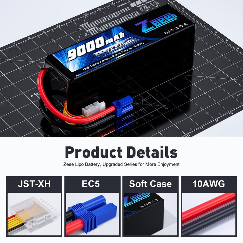 Zeee is a professional brand specializing in the research, development, production and sales of Li-polymer batteries. Features - Light weight, long cycle life, no ''memory-effect''. - High power battery, high capacity provide your rc model more energy, more enjoyment. - High Discharge rate, make your rc vehicle work powerfully. Specification Brand: Zeee Cell Number: 6 Voltage(V): 22.2V Capacity(mAh): 9000mAh Discharge Rate (C): 100C Charge Plug Type: JST-XH Discharge Plug Type: EC5 Plug Battery Dimension: 166*49*63.5mm/6.54*1.93*2.5inch Approx Weight: 1136g/40.07oz Compatible RC Models - Zeee 6S 100C 9000mAh Lipo Battery compatible with RC Car, Truck, RC Tank, Racing Models, etc. (only if the voltage, dimension and plug match, then it will fit for your models). High Performance - Zeee 22.2V lipo battery 9000mAh with 100C discharge rate offers you very high power and very long run time for your RC cars. - Zeee 22.2V 6S lipo battery 9000mAh provides your batteries very solid protection, it comes with an equipped EC5 plug. They are your ideal chooses for the RC car hobby. Package Including 2 Pack of Zeee 22.2V 100C 9000mAh Lipo Battery with EC5 plug Attention1) Lipo batteries are potentially hazardous. Improper usage can cause fire or explosion. 2) Charge only with a lithium polymer (LiPo) battery charger 3) Do not charge the battery to more than 4.2V per cell & Do not discharge below 3.2V per cell under load 4) If the new battery wont hold a full charge or loss the charge very quickly in a short time, please use Balance Charger to charge and recycle several times first.