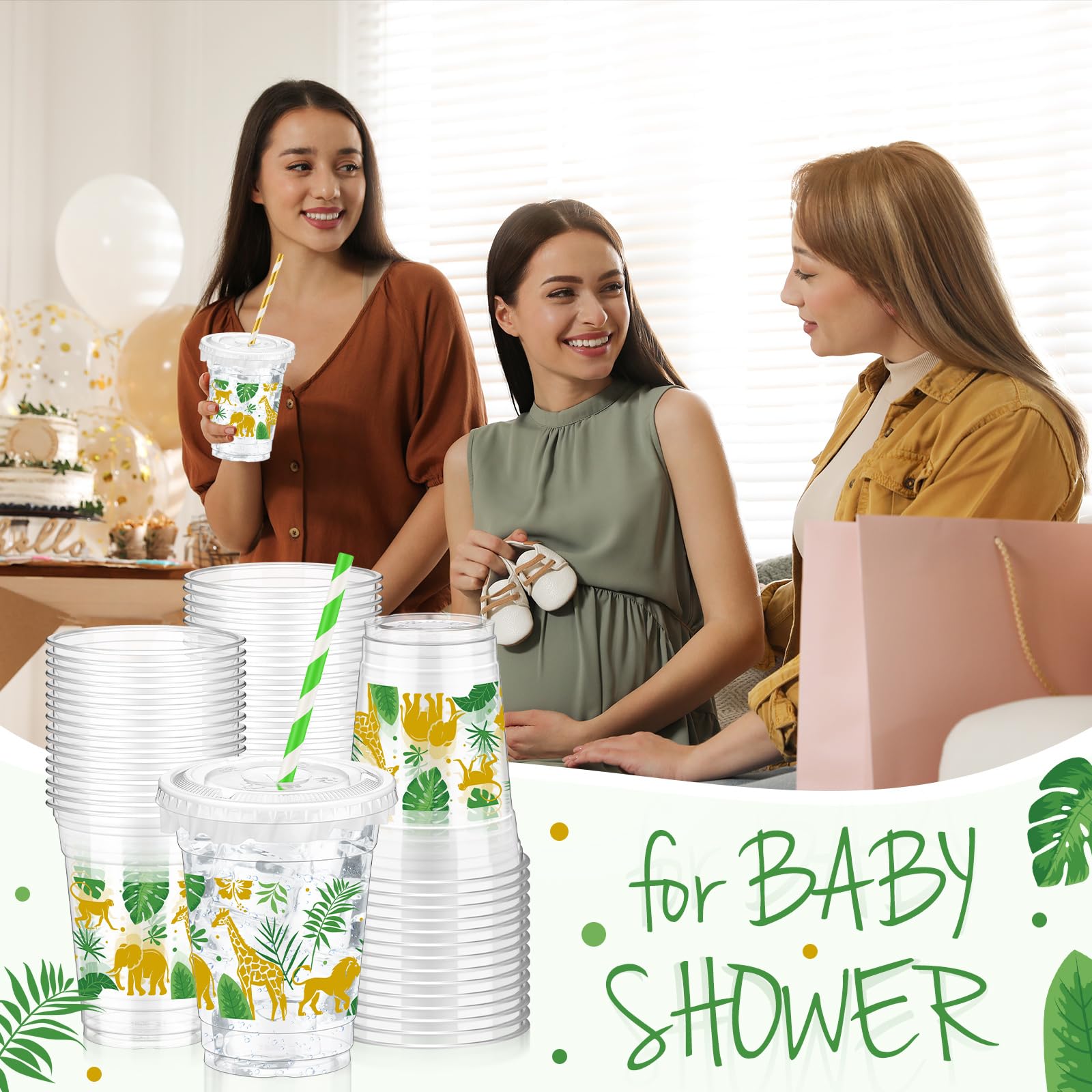 Foldtier 50 Pcs Jungle Safari Animals Cups Disposable Plastic Cup 12 Oz Golden Green Cups Thick Wild Theme Clear Cups Lids Straw