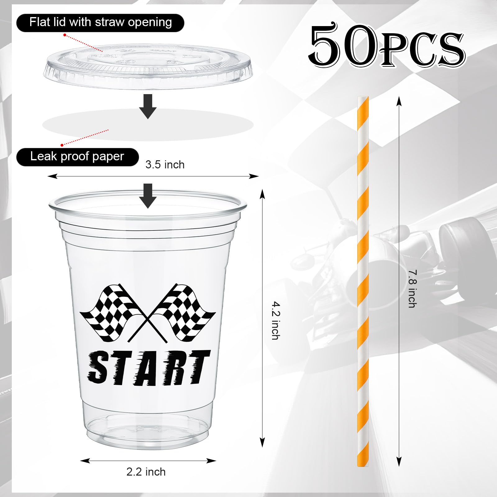 - Q: Are the lids and straws included with the cups? A: Yes, each package includes 50 lids and 50 paper straws, along with 50 race car themed plastic cups and 1 pack of 50 leakproof paper to prevent spills.