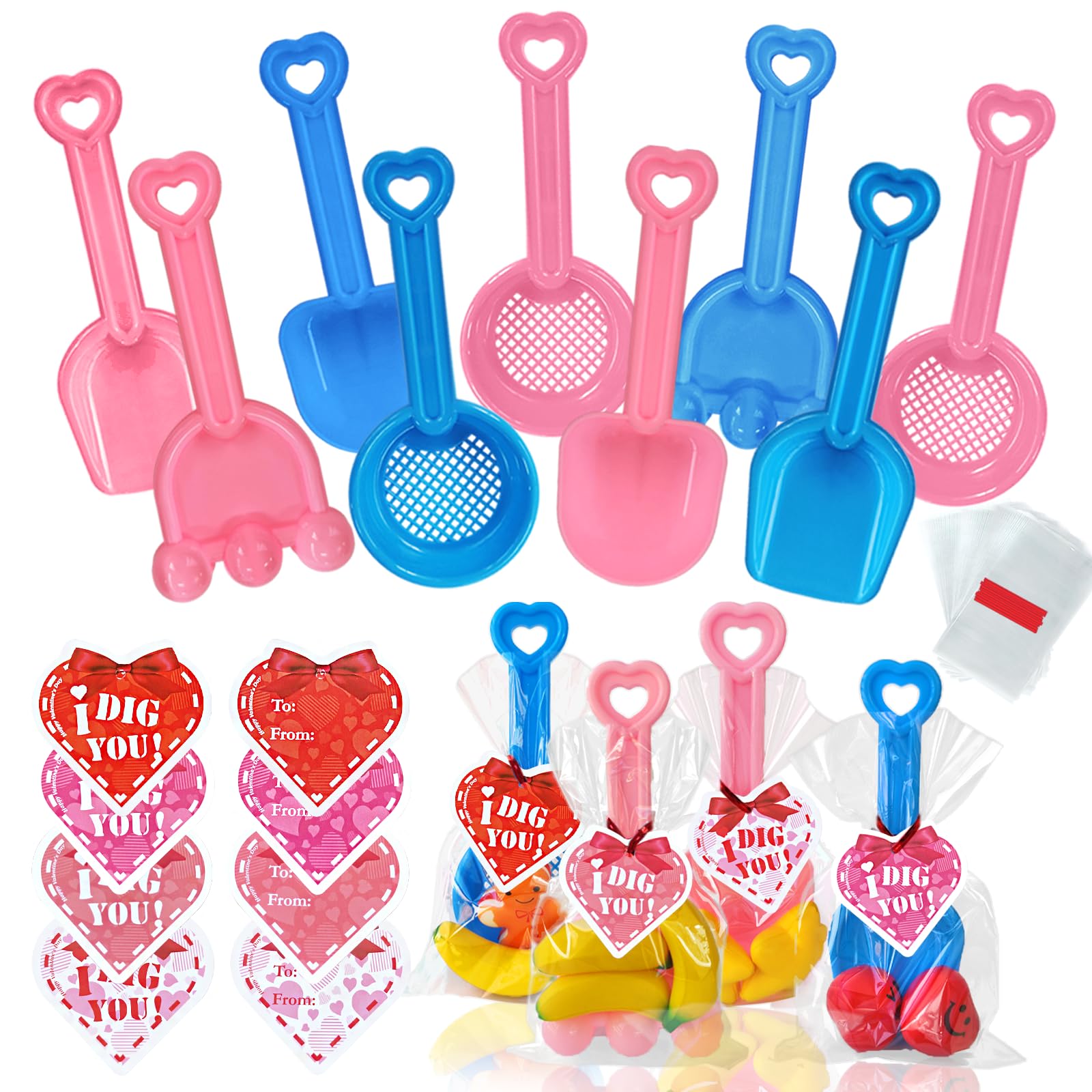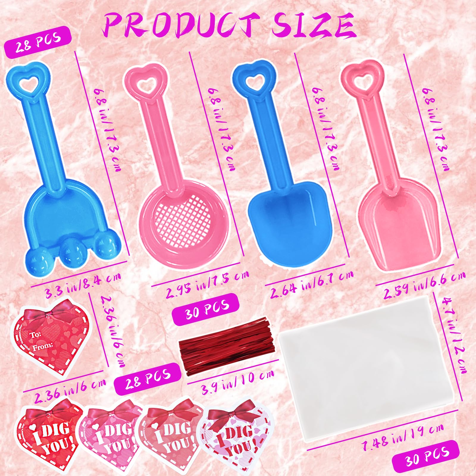 - Q: What comes included in the 28 set shovels package? A: The Fvcisshhu 28 Set includes 28 plastic shovels in two colors, 28 heart-shaped 'I Dig You' cards, 30 candy bags, and 30 red wire ties. This comprehensive set is ideal for creating fun and memorable gift bags.