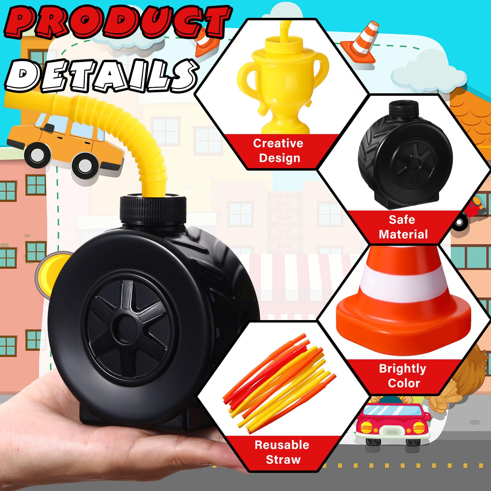 Mifoci Race Car Cups with Straws Plastic Traffic Cone Cups Tire Cups with Straws for Kids Yellow Trophy Cups Construction Party