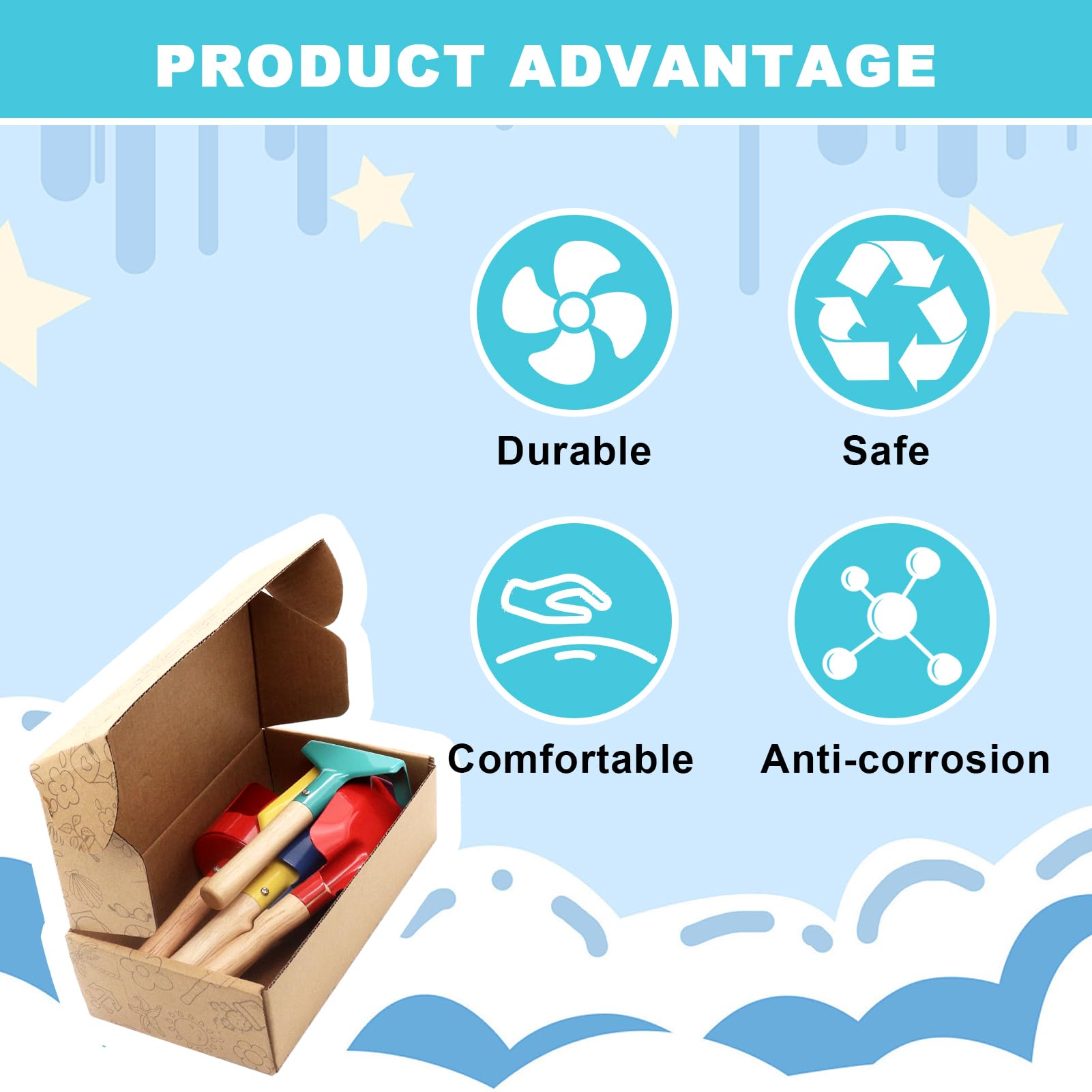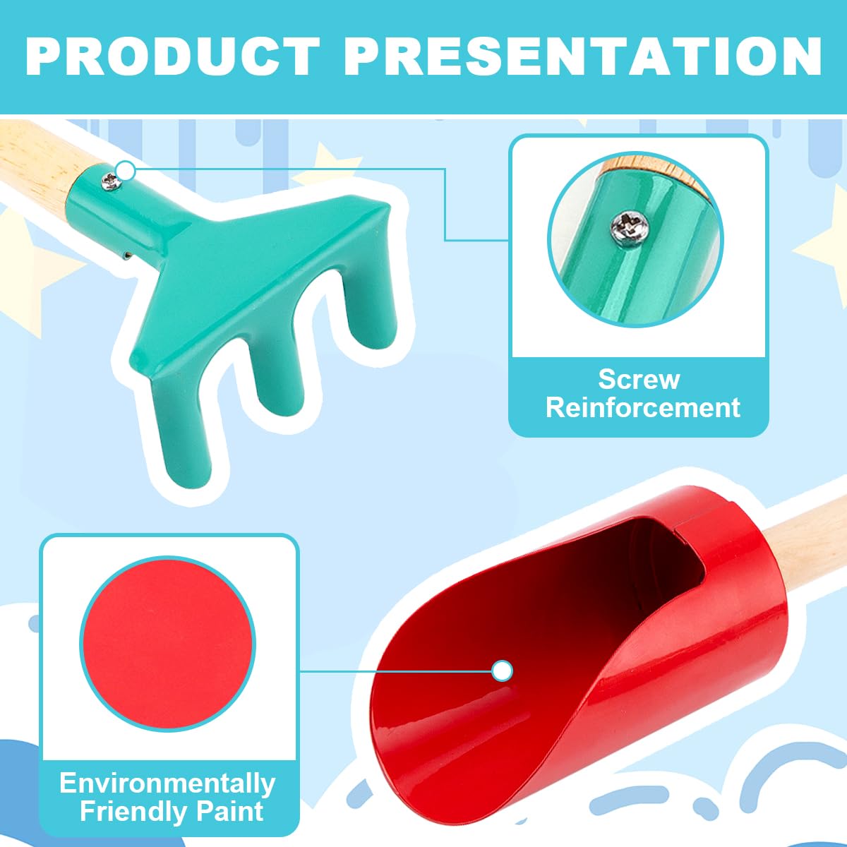 • Q: Are the tools in the beach toy set safe for children? A: Yes, the tools are made with rounded edges and are constructed from quality metal and durable hardwood handles, ensuring they are safe for children to use during beach play or gardening.