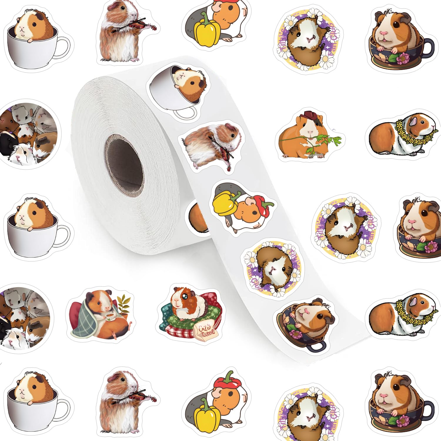 - Q: What are the dimensions of the Guinea Pig Stickers? A: Each sticker in the roll measures 1 inch, making them perfect for various decorative applications.