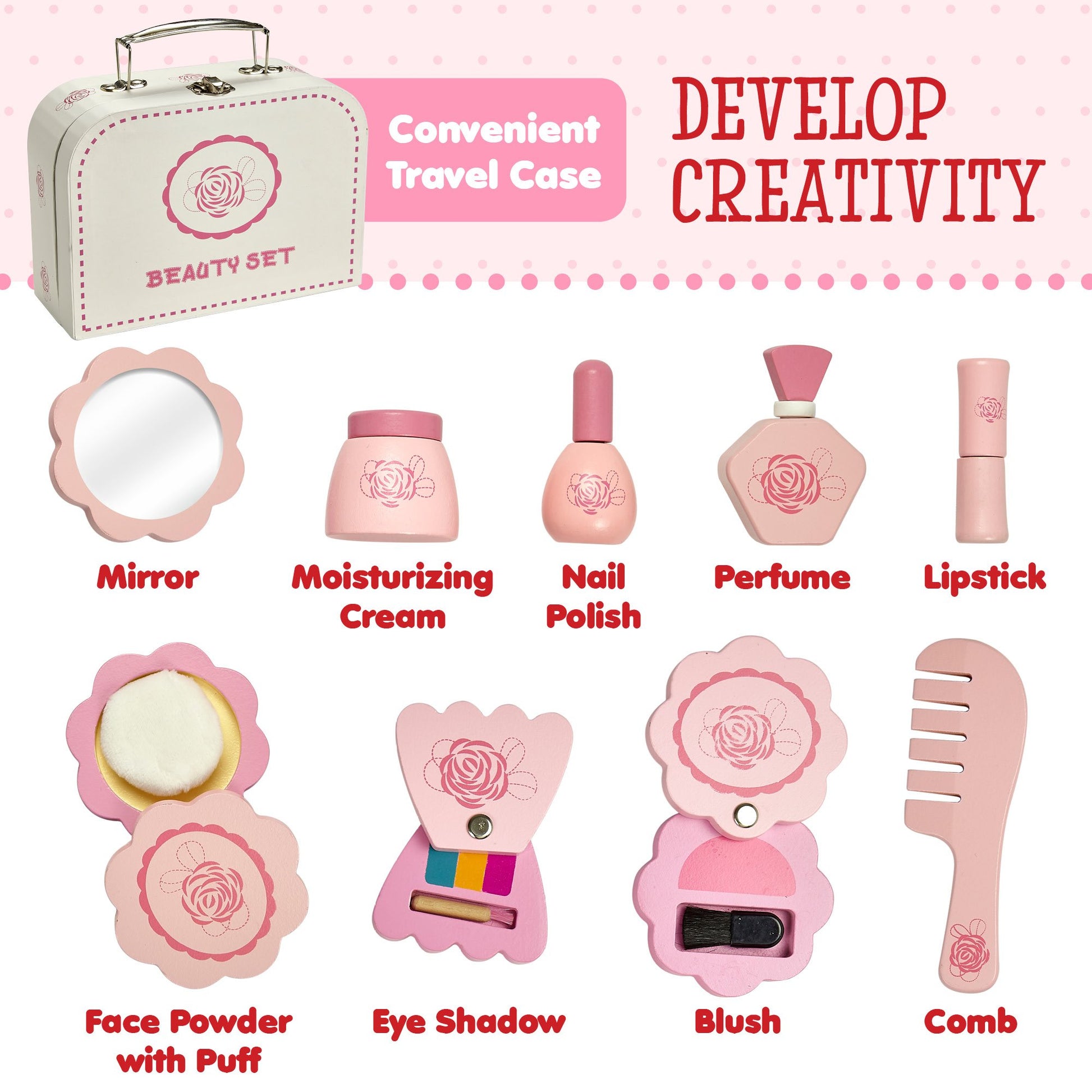 Your little girl can put makeup on just like mommy without creating a mess! The Dragon Drew Beauty Set features 10 different pieces that are all made from premium quality wood. Every piece is made from renewable resources using non-toxic paint and is crafted with child-safe edges so children as young as three years old can enjoy the fun! Encourage your children to explore their imagination. Playing dress up is fun and with this carefully crafted cosmetics set your little princess can get creative.PRODUCT FEATURES: 3 Years + 10 Piece Set 100% Real Wood Non-Toxic Paint Child-Safe Edges Develops Motor Skills Playful Design Carrying Case Is Perfect for Traveling and Storage Encourages Imagination and CreativitySET INCLUDES: Mirror Moisturizing Cream Nail Polish Perfume Lipstick Face Powder with Puff Eye Shadow Blush Comb Travel Storage Case ENCOURAGE YOUR CHILDS CREATIVITY! Enhance your childrens developmental skills and encourage them to use their imagination and creativity. This playset includes a variety of cosmetic and beauty toys that mimic real life beauty products and tools. Whether your little girl is getting ready for a tea party or playing dress up with her friends she can imagine shes using real eyeshadow, lipstick, blush, face powder or nail polish. Every piece is carefully crafted and made with kids in mind. ABOUT USAt Dragon Drew we believe imagination is vital to the growth and brain development of children so we are dedicated to creating high-quality toys that help stimulate little minds. All of our childrens toys are crafted from premium quality materials. Each toy is designed with detail in order to provide kids with the most realistic looking play toys. We use renewable resources and child non-toxic paint to ensure your child is safe while they play. If you can dream it we can create it!