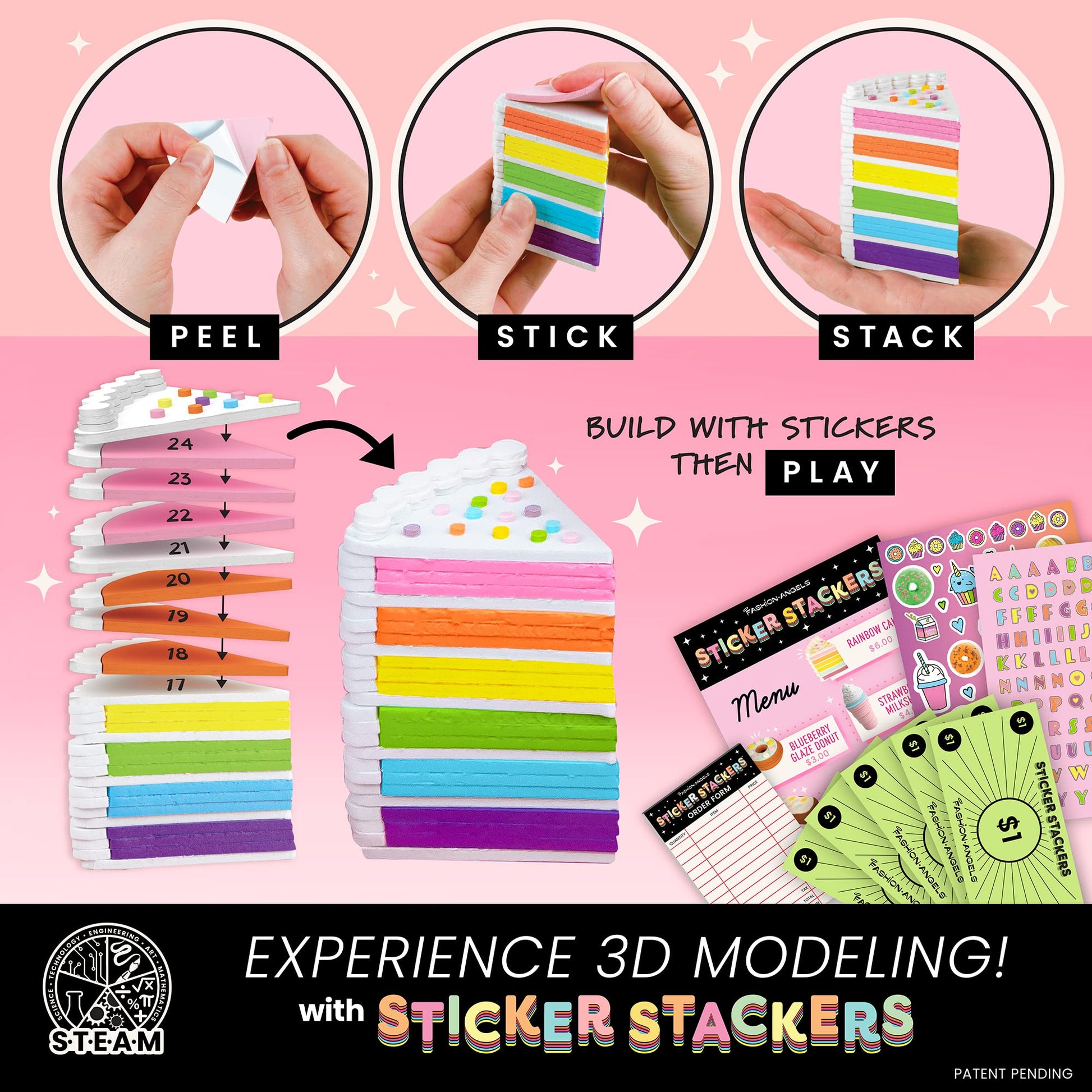 - Q: What materials are included in the Sticker Stackers Set? A: The set includes 46 sheets of foam stickers, a serving tray, a 30-sheet order cube, a menu card, a bakery box, 15 pieces of play money, 3 additional sticker sheets, and instructions for use.