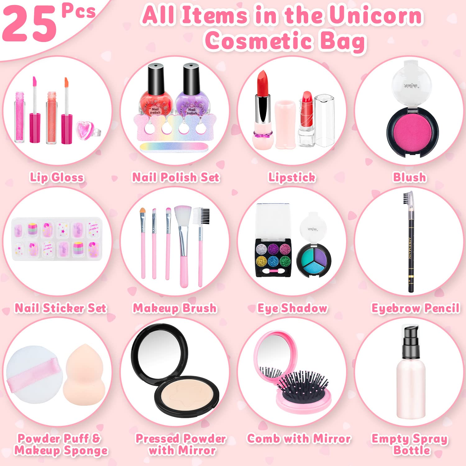 - Q: What items are included in the Hollyhi Kids Makeup Kit? A: The kit includes 25 pieces: 2 lipsticks, 2 lip glosses, 1 ring lip gloss, 1 pressed powder with mirror, 1 blush, 1 trio eye shadow, 1 6-color gloss eye shadow with brush, 1 eyebrow pencil, 1 powder puff, 2 nail polishes, 1 toe separator, 1 nail file, 1 nail sticker set, 1 empty spray bottle, 4 makeup brushes, 1 comb with mirror, 1 unicorn ring, 1 unicorn bracelet, and a unicorn carrying bag.