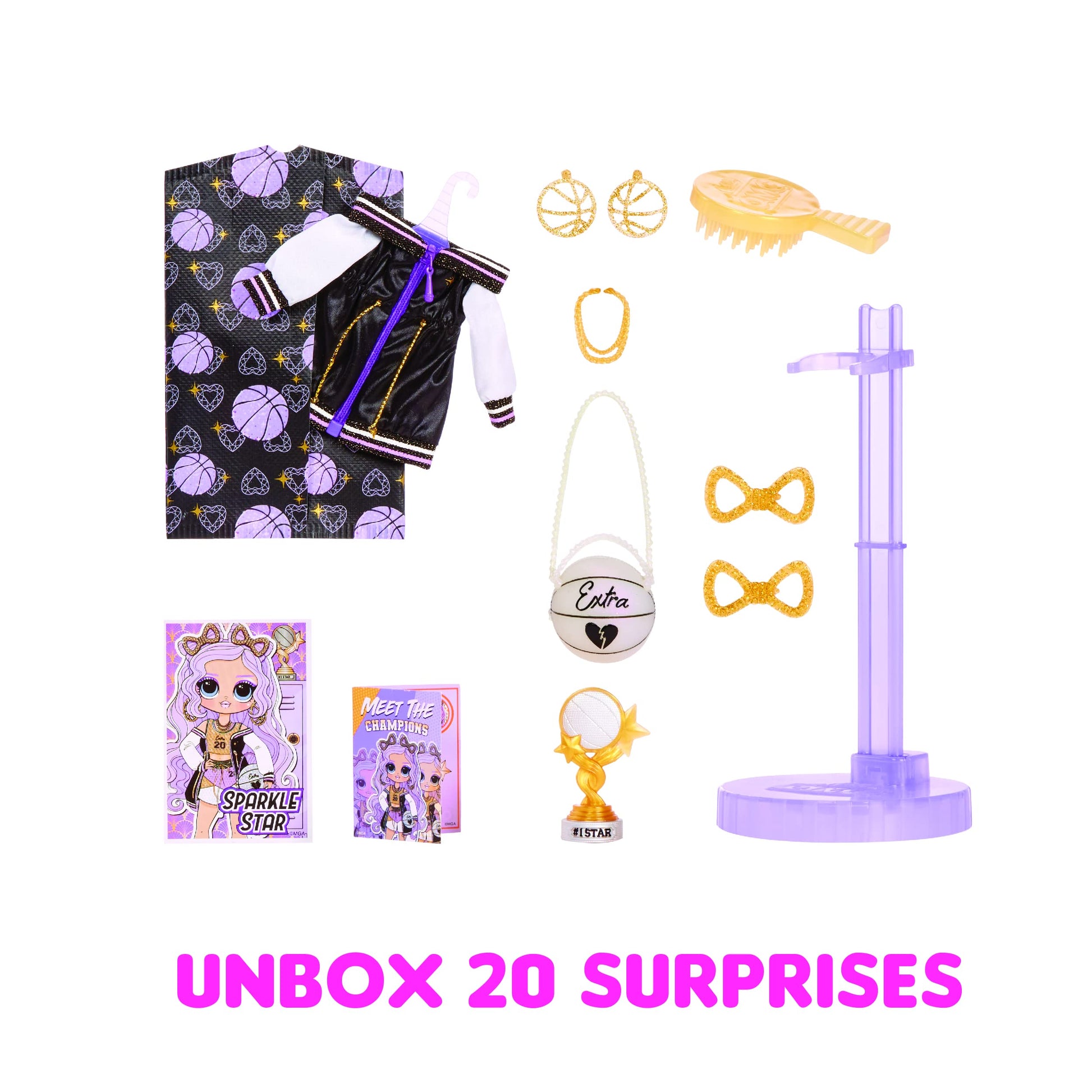 - Q: What is included in the L.O.L. Surprise! OMG Sports Fashion Doll Sparkle Star package? A: The package includes the L.O.L. Surprise OMG Sports Fashion Doll Sparkle Star, a fierce outfit, sparkly sports-themed accessories, shoes, a hairbrush, and a doll stand, totaling 20 surprises to unbox.