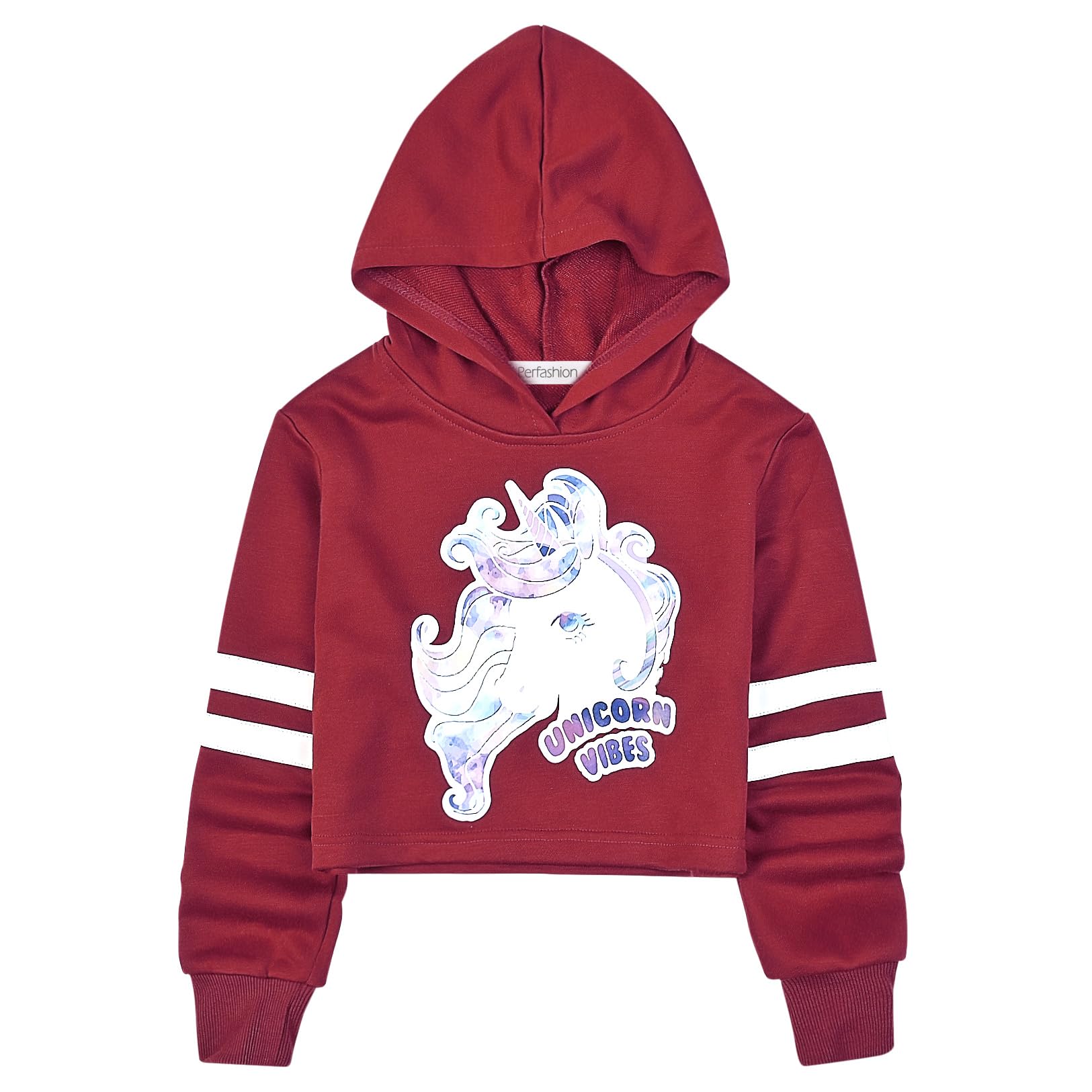 Perfashion Girls Cropped Hoodies Long Sleeve Burgundy Pullover Size 6 7 Unicorn Sweatshirts