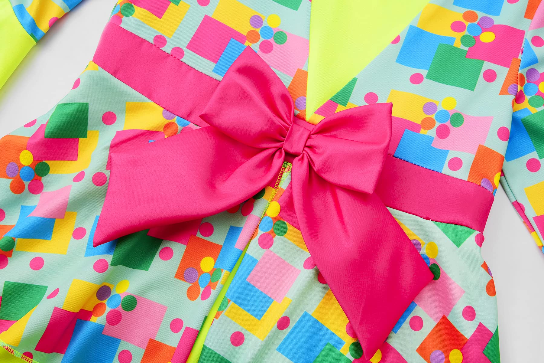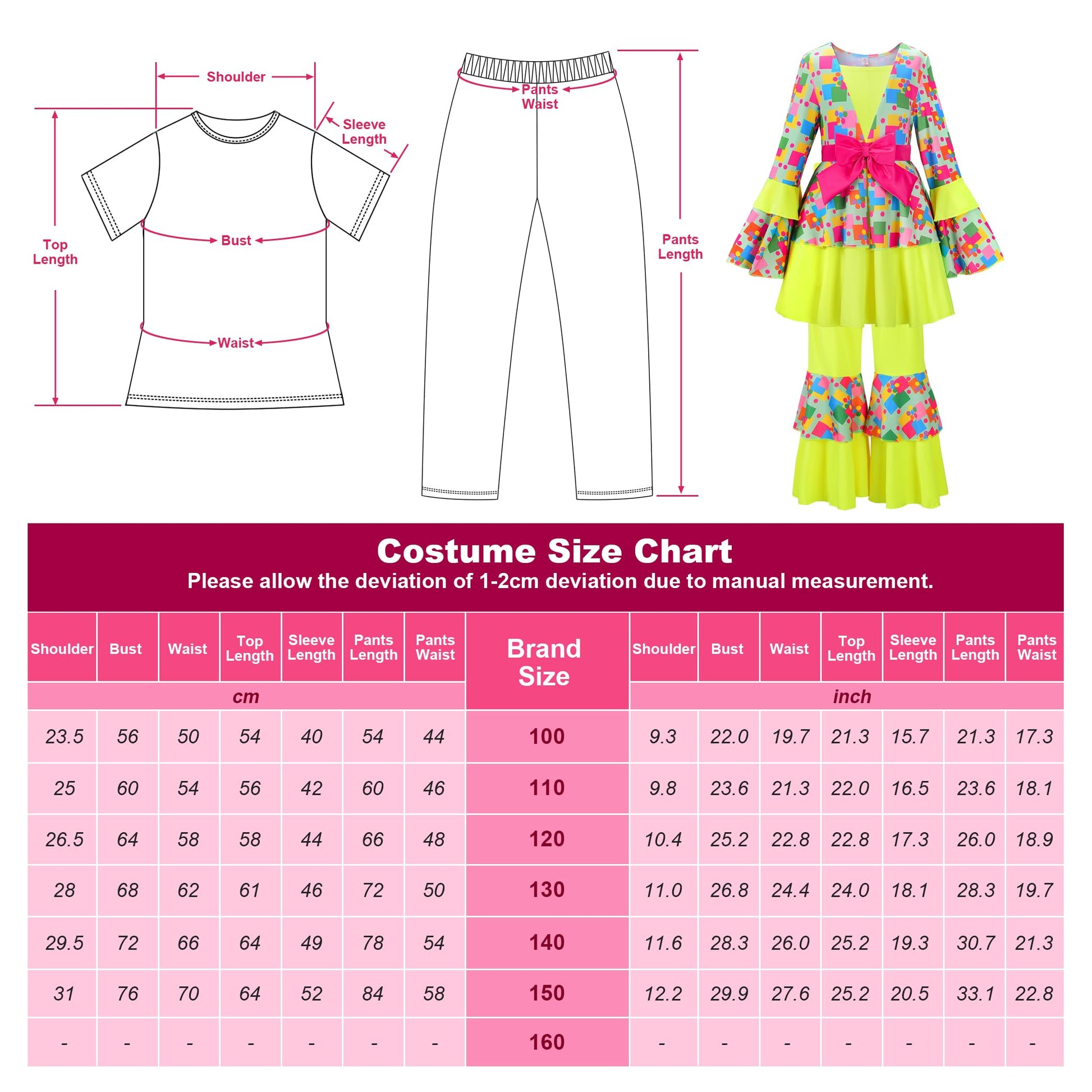 ?? Package includes: Top, pants, toy glasses, adjustable headband, toy microphone and toy guitar | ?? Unique Design: The exclusive design of colorful irregular and geometric fabrics is one of the design highlights; the colorful graphics fabrics and bright yellow-green color contrast is unique and eye-catching | ?? High quality, soft and comfortable milk silk fabric material. Relibeauty has always paid attention to the quality of products, please rest assured to order. | ?? This decorative suit is suitable for all events, halloween, carnival, daily cosplay and other parties etc. | ?? Please check the size chart in the picture before placing an order.