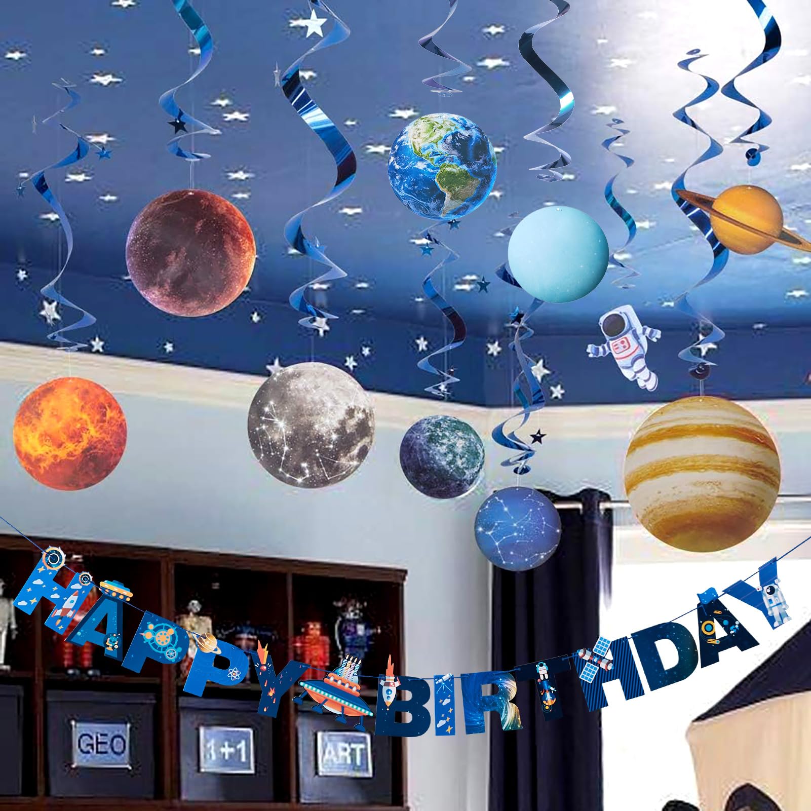 Packing List: A Bunch Of Cosmic Space Birthday Banners, 12 Solar System Hanging Swirls (10 Planet Card Swirls + 1 Astronaut + 1 Rocket). The Outer Space Hanging Vortex Is Made Of High-Quality Aluminum Foil And Cardstock, Printed On Both Sides, Flat-Packed, And Has A Plastic Hook On Top To Hang And Ready To Use.