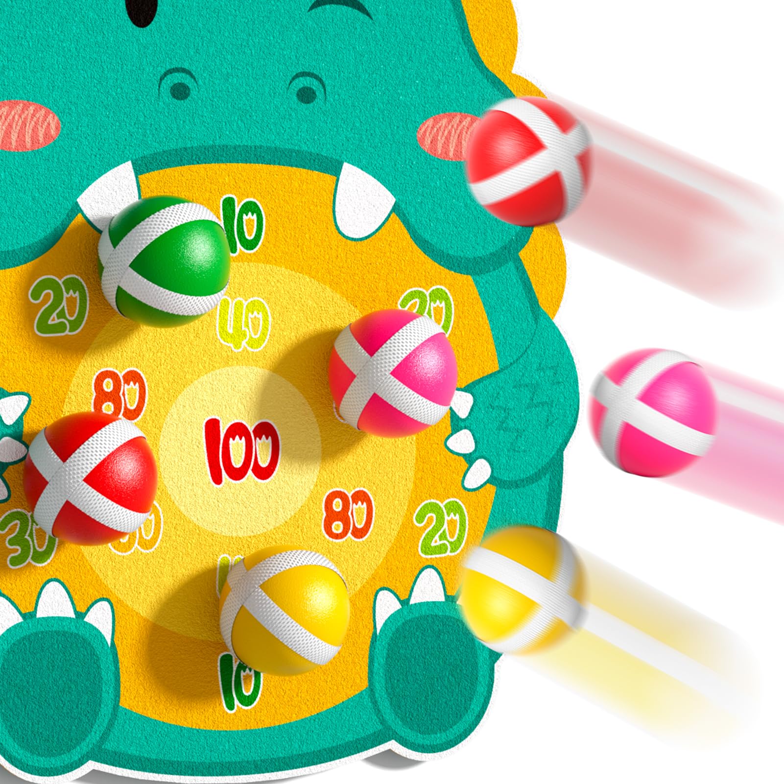 - Q: What are the unique features of this dinosaur dart board toy? A: The dinosaur dart board toy offers two ways to play: kids can either use the dinosaur launcher to fire the balls or throw them by hand. Additionally, it features a hangable design for easy setup and play in various locations.