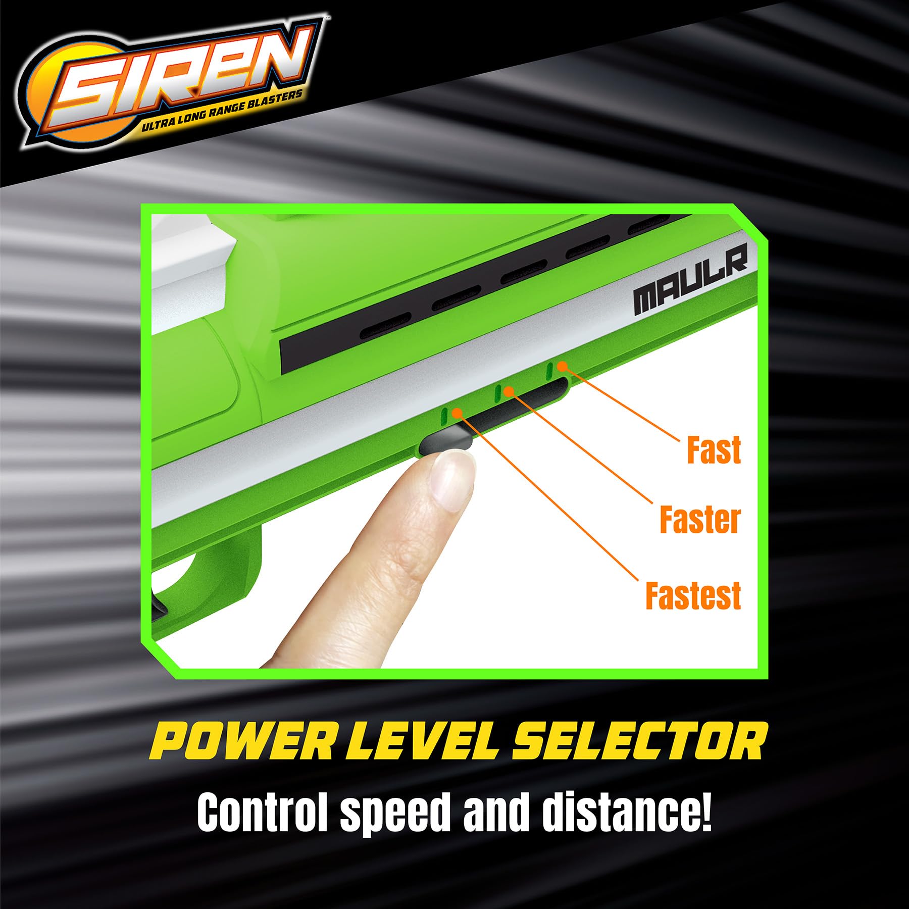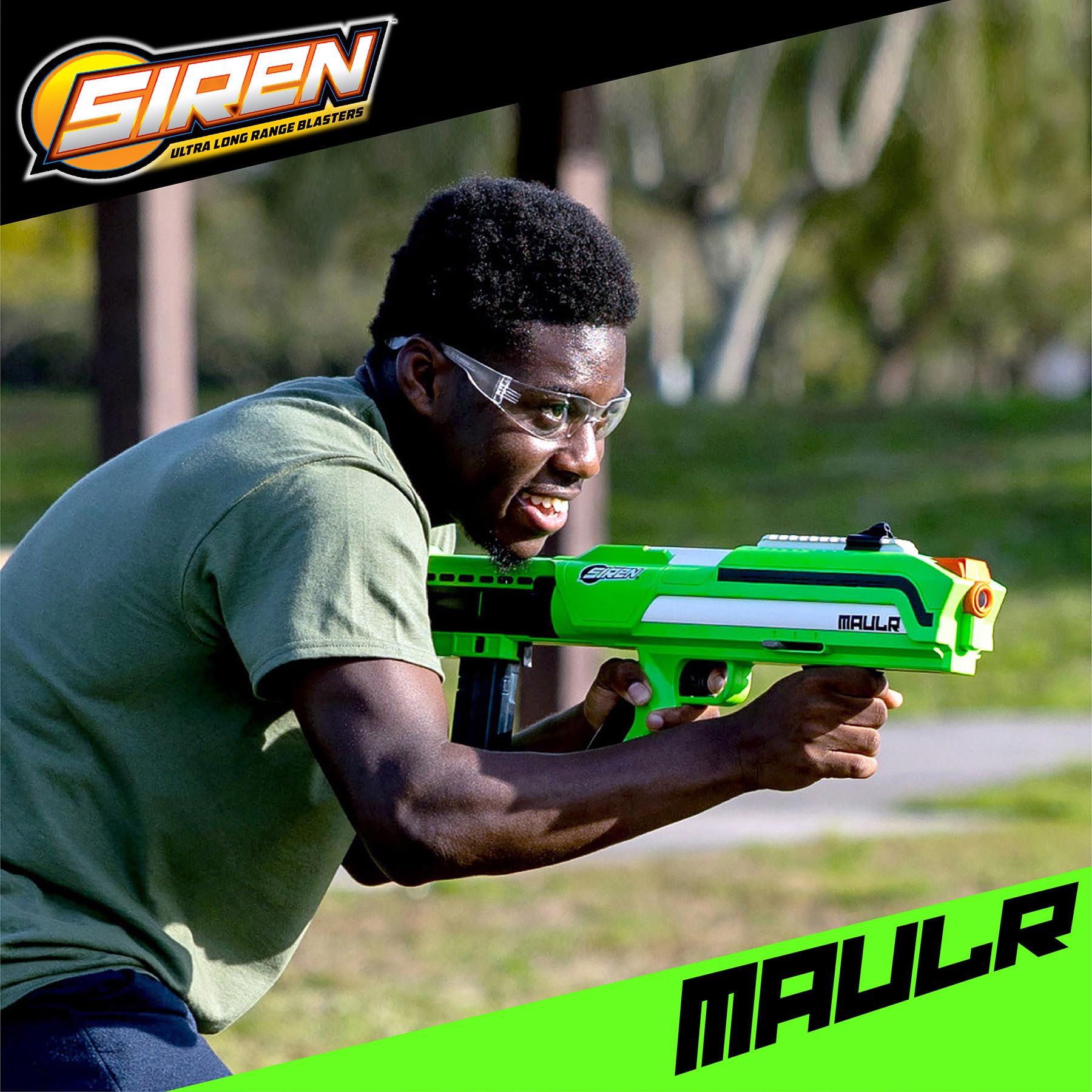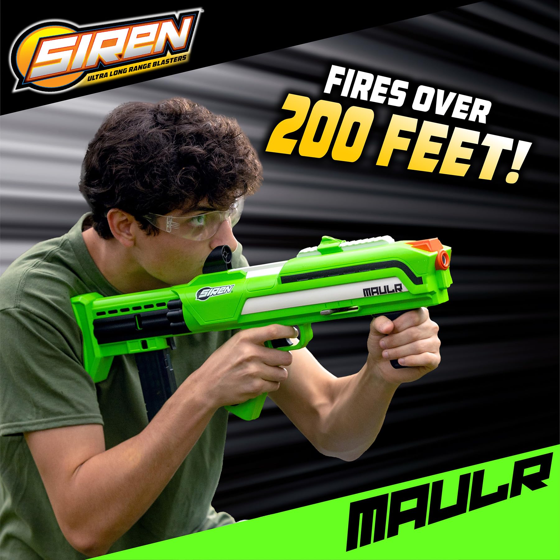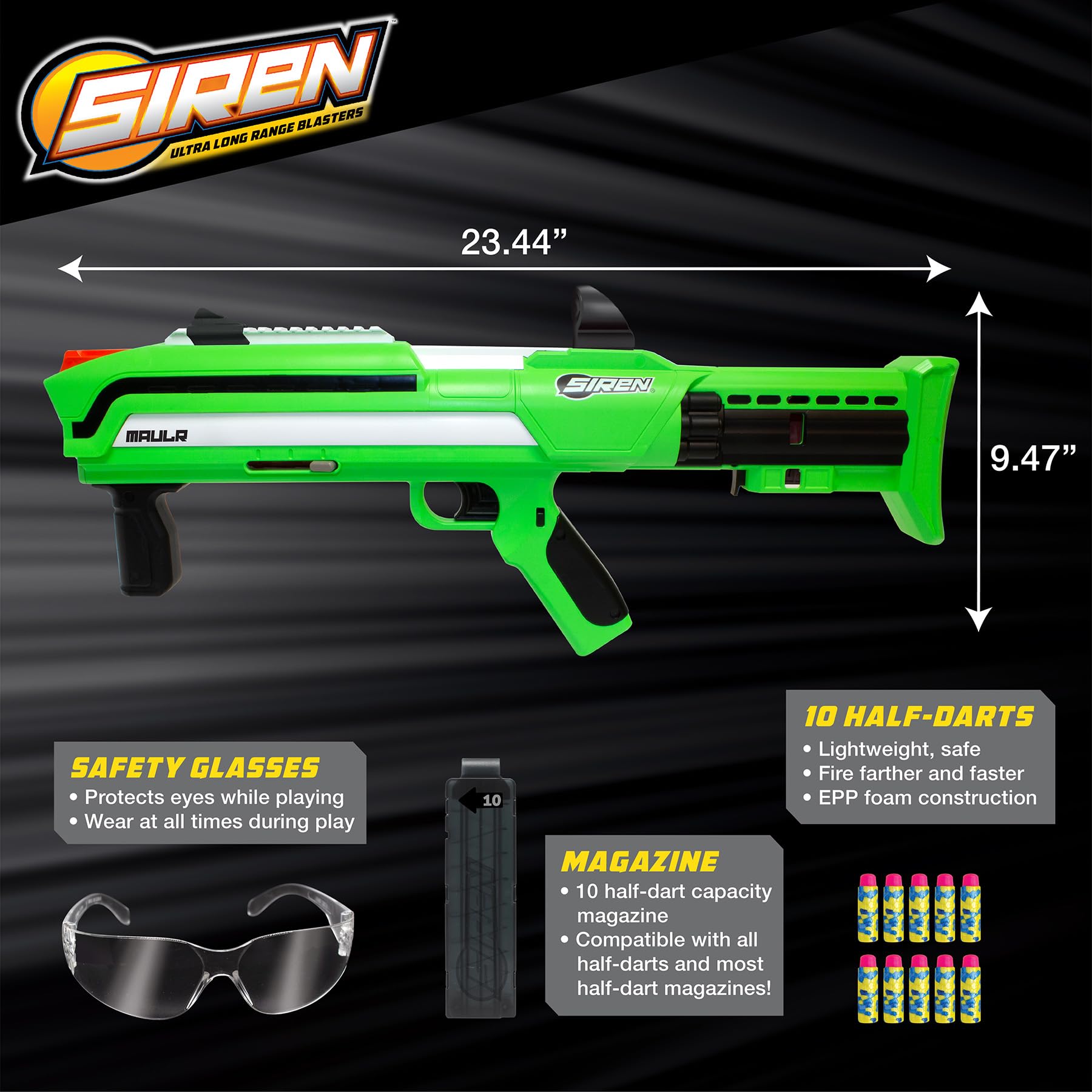 The Siren Maulr Pump-Action, Multi-Shot, Foam Dart Blaster fires over 200 feet - at speeds of more than 220 feet per second! With a 10 half-dart magazine and precision barrel, it is the farthest-shooting of the first-generation Siren Ultra Long Range Blasters. Three adjustable firing power levels (Fast - Faster - Fastest) allow you to control speed and distance. It also features a Picatinny rail that lets you attach your own accessories (like ammo holders, grips, and laser sights) and a trigger safety, for when not in use. All Siren Blasters are compatible with most half-darts and half-dart magazines, but Siren Ultra High Performance Dart Refills are recommended for maximum durability and performance (sold separately). Set includes: 1 Maulr blaster, 10 foam half-darts, 10 half-dart magazine, safety glasses, reusable storage case, and instructions. Ages 14+.