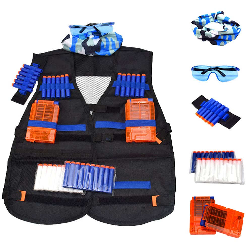 - Q: What items are included in the Tactical Vest Accessories Set? A: The Tactical Vest Accessories Set includes a tactical vest, a wrist ammo holder, two quick reload clips, safety glasses, a tube scarf mask, and 20 refill darts (10 blue and 10 glow in the dark).