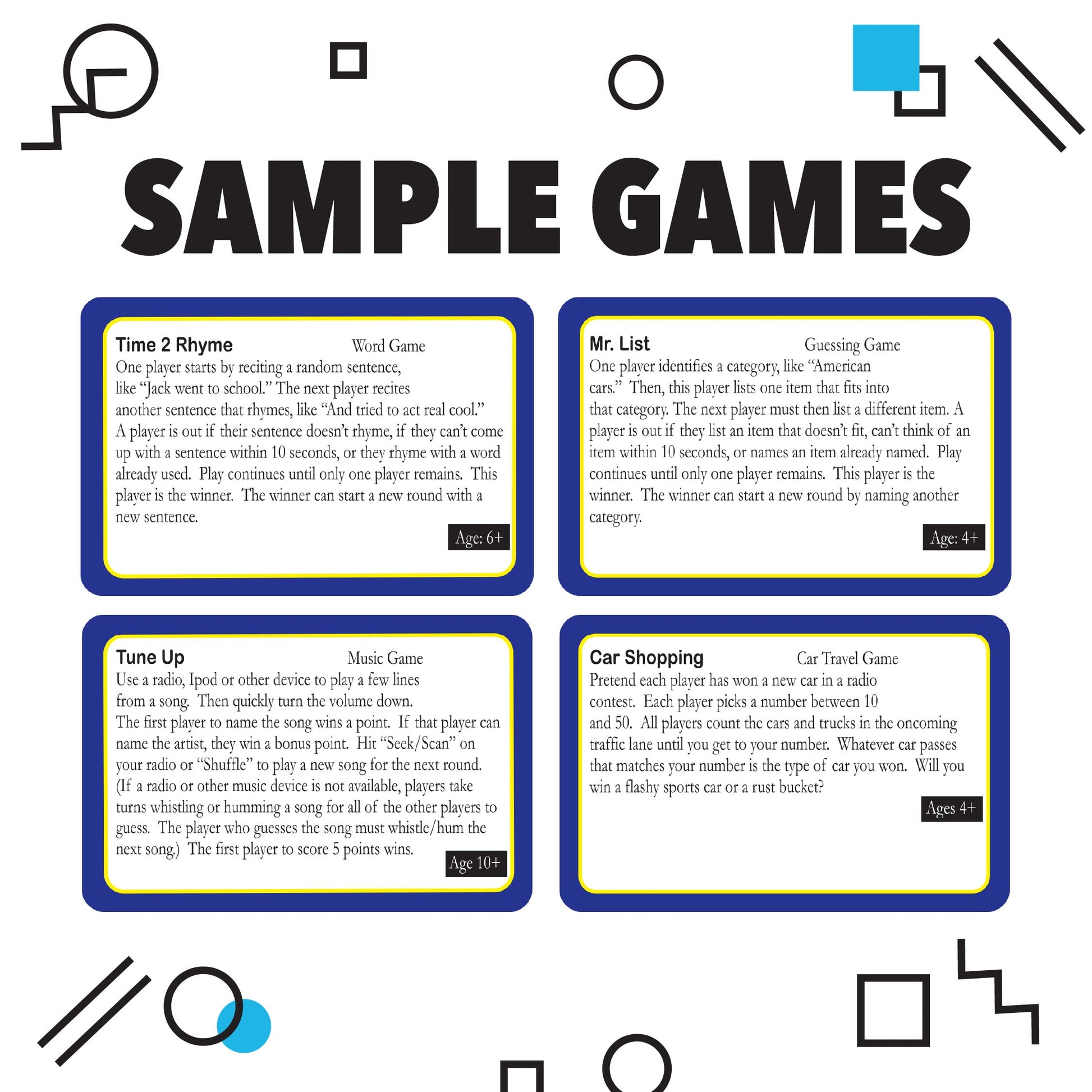 Product DescriptionProduct Description Turn family road trips and moments of in-between time into great family fun. Games on the Go is a collection of 50 games and activities that can be played anywhere at any time. No materials are required just your familys ideas and imagination. Turn any night into family game night. The collection includes guessing games, word games, memory challenges, trivia, searching games and much, much more. Games on the Go is a portable game collection that can be clipped to a purse or bag and played in a car, at the dinner table, at a party or on trips. It is designed to go anywhere you go and be at the ready when the time is right for family fun. Playtime 5 minutes+. From the Manufacturer Games on the Go - Turn family road trips and moments of in-between time into great family fun. Games on the Go is a collection of 50 games and activities that can be played anywhere at any time. No materials are required.just your familys ideas and imagination. The collection includes guessing games, word games, memory challenges, trivia, searching games and much, much more. Games on the Go is a portable game collection that can be clipped to a purse or bag and played in a car, at the dinner table, at a party or on trips. It is designed to go anywhere you go and be at the ready when the time is right for family fun.From the ManufacturerGames on the Go - Turn family road trips and moments of in-between time into great family fun. Games on the Go is a collection of 50 games and activities that can be played anywhere at any time. No materials are required.just your familys ideas and imagination. The collection includes guessing games, word games, memory challenges, trivia, searching games and much, much more. Games on the Go is a portable game collection that can be clipped to a purse or bag and played in a car, at the dinner table, at a party or on trips. It is designed to go anywhere you go and be at the ready when the time is right for family fun.