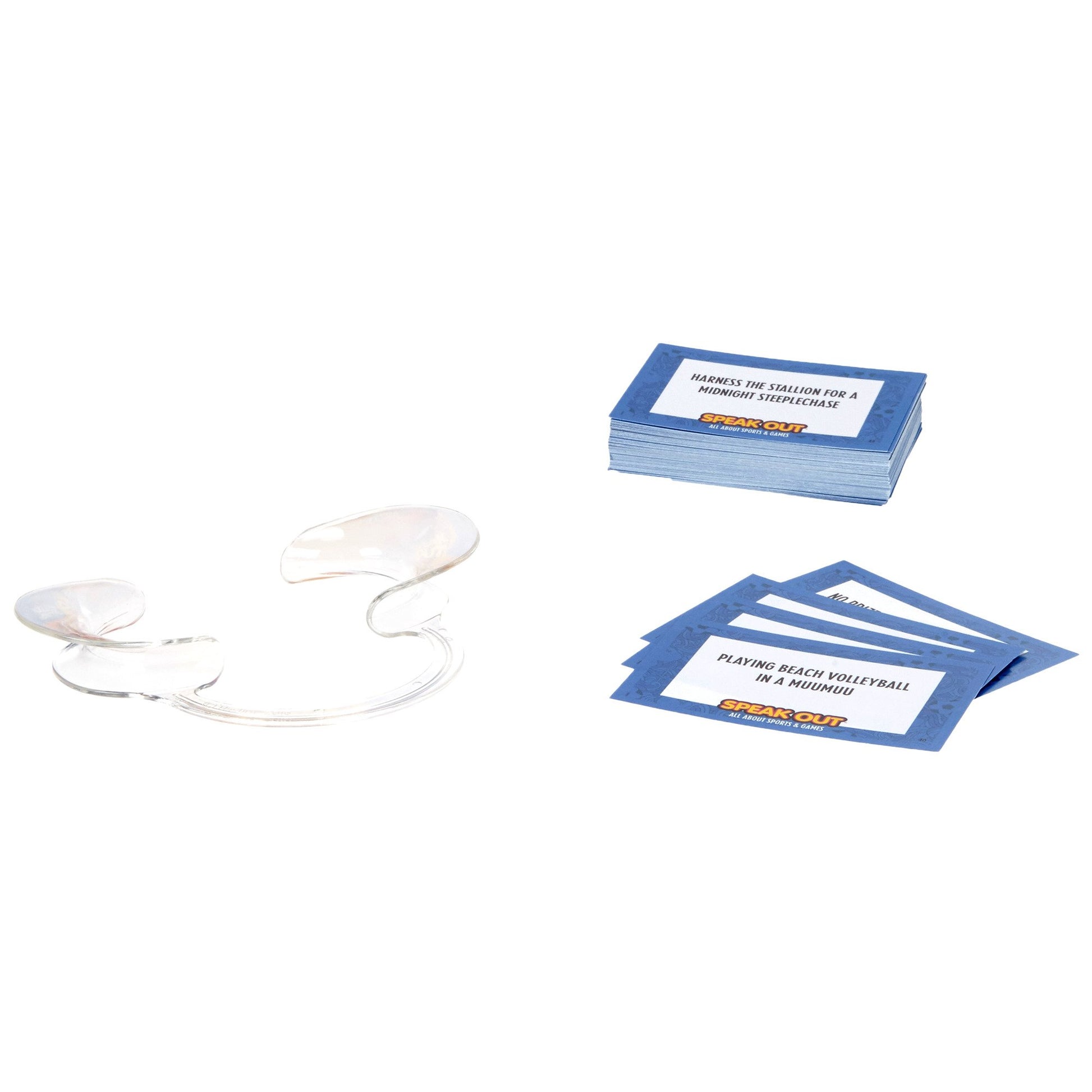 Get friends together for some sidesplitting fun as players try to say different phrases while wearing a mouthpiece that wont let them shut their mouth. This expansion pack features wacky phrases that relate to sports and games that will challenge players and generate lots of laughs. Players draw from the deck and read the phrase as best as they can, but its not so easy to do when the mouthpiece is hindering them from forming words correctly. Players try to say phrases such as Flag football is non-contact fun or Six strikes and youre out twice. Teammates must correctly guess the phrase in under a minute in order to earn the card. The team with the most cards at the end of the game wins. The expansion pack can be added to the original Speak Out game or 1 player can use the mouthpiece and everyone else can guess what he or she is saying. (Timer not included in expansion pack.)Hasbro Gaming and all related terms are trademarks of Hasbro.