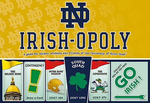 Product DescriptionEnjoy this themed monopoly style game with a Irish twist. Fun and educational. Collegiate theme. Recognize your favorite places and tokens.From the ManufacturerThe IRISHOPOLY board game is perfect for Notre Dame Alumni, students and future grads. Tokens include fighting Irishman, football, shamrock, alarm clock, and bicycle. Board spaces include the golden dome, Notre dame stadium, law school, fighting Irish band, the huddle, St. Michaels laundry, and St. Josephs lake.