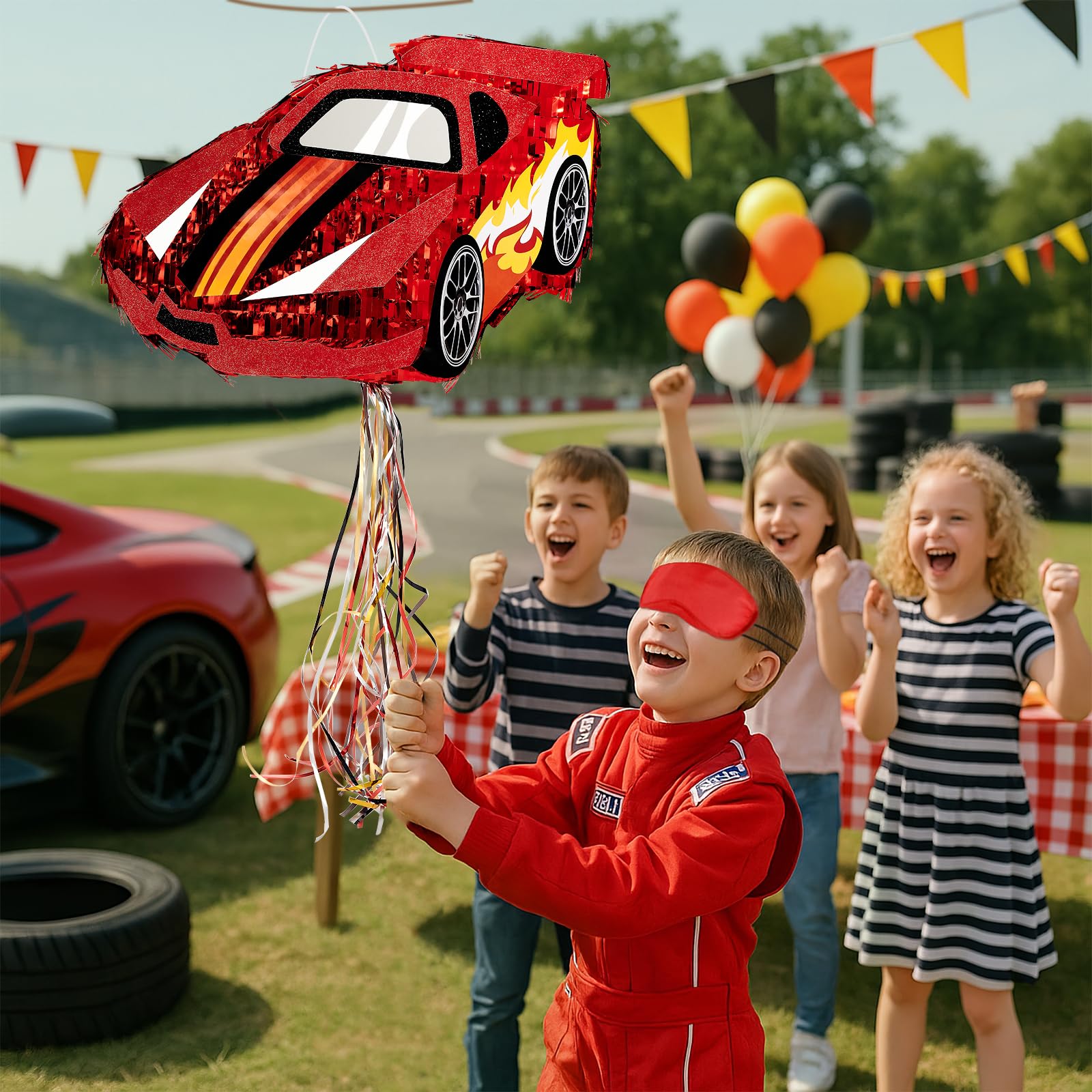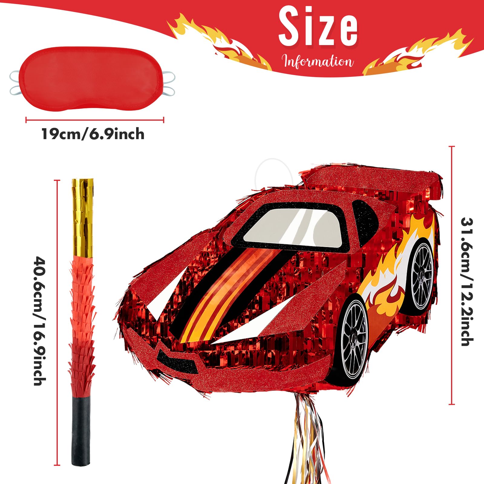 This racing car themed piata will easily attract the attention of guests at a themed birthday party with its eye-catching red design. Whether used as a decoration or as part of a game session, it will add unlimited vitality and fun to your party. The set includes a racing car piata, a pair of eye masks and a piata stick to meet your party game and decoration needs without having to purchase additional products. The piata measures approximately 13.4 x 16.5 x 3 inches and is made of sturdy corrugated paper to ensure that it can maintain its shape and function after multiple knocks. The pre-made hole and sturdy hanging ring on the top are easy to hang, and the filling port has a convenient sticker opening for filling in a variety of small gifts that children love. This racing car themed piata is suitable for a variety of activities, such as racing car themed parties and boy parties. It is not only an eye-catching decoration at the party, but can also be used as a prop for fun games.