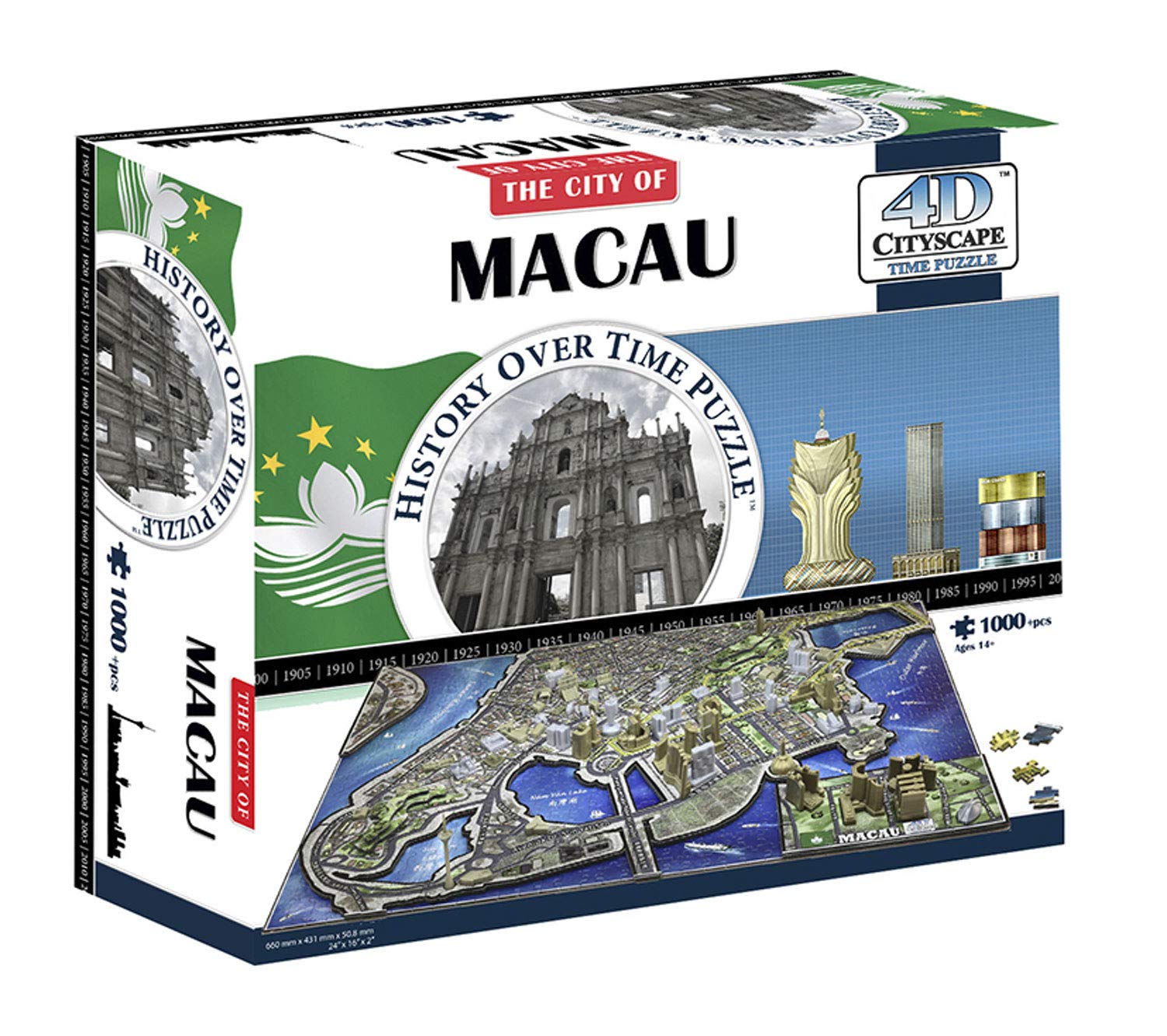 This award-winning puzzle recreates Macau's famous skyline, not only in three dimensions using scale-model buildings, but also along the fourth dimension of time, spanning over 600 years of architectural history. The puzzle includes 64 plastic building replicas that depict the city as it appeared as far back as 1558 through to present day. The puzzle includes such famous structures as the Ruins of St. Paul's, Section of the Old City Walls, A-Ma Temple and the Grand Lisboa Hotel. The buildings fit into pre-cut holes in a traditional 2D jigsaw puzzle that form the city's street layout. The product includes a Time Poster that directs you through time as you rebuild Macau famous history. Puzzle measures approximately 24'' x 16'' x 2'' and includes just over 1,000 pieces! Ages 14+.There are several other 4D Cityscape Puzzles to choose from also so check them out for hours of interactive play.