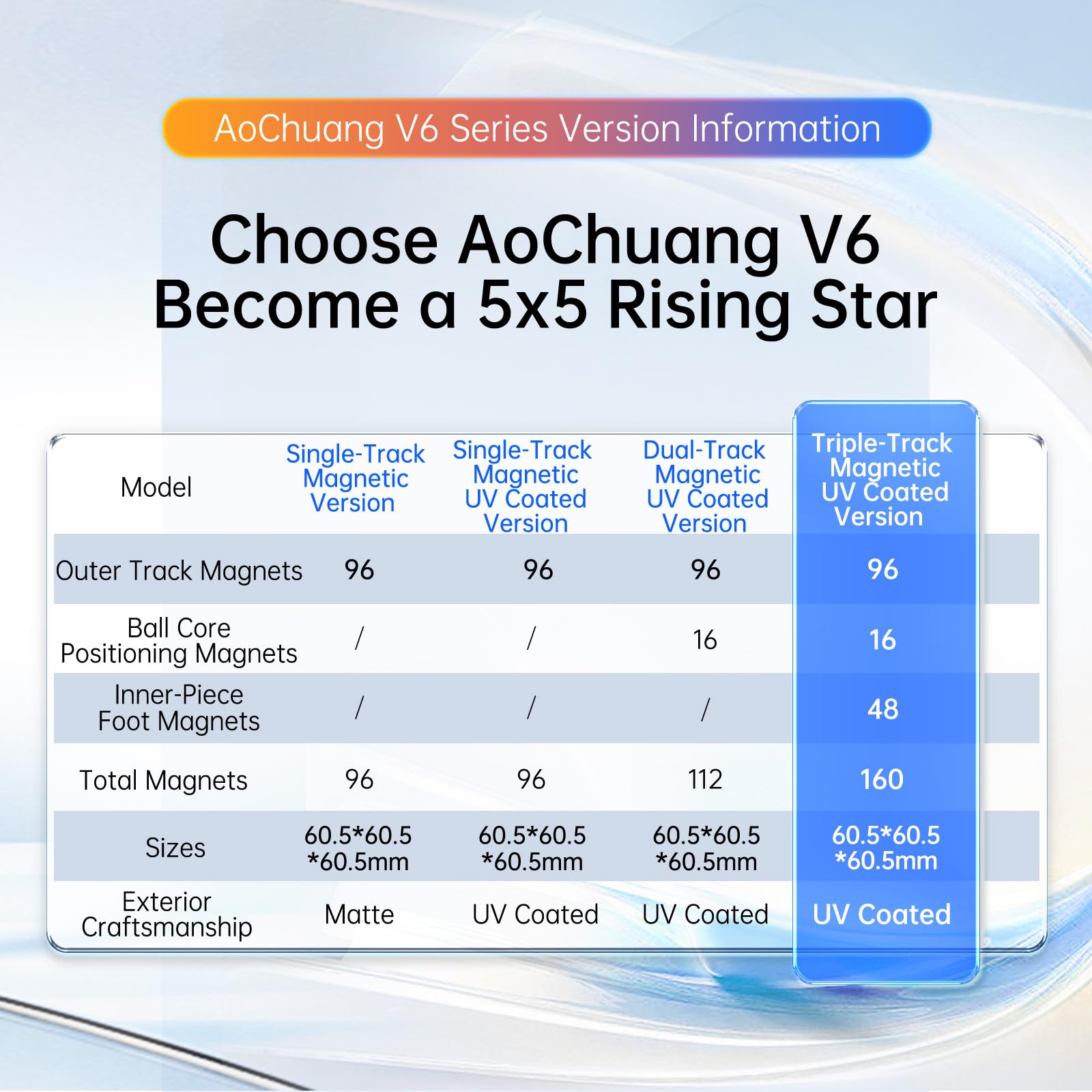 2024 Flagship Edition Cube: MoYu Aochuang V6 5x5! Experience the next evolution of 5x5 speed cubes with unmatched precision and stability. With its revolutionary design and compact 60.5mm size, The Aochuang V6 is the ideal cube for competitive cubers seeking record-breaking solutions! | Magnetic Positioning: The standard UV coated version comes equipped with 96 outer track magnets. This ensures a seamless and precise layer alignment, giving you the edge in speed and stability during even the fastest solves. | Six-Sided Integration: The Aochuang V6 features a Six-Hole Integrated Core that stands upright, firmly embedded with the center piece. Say goodbye to misalignment and lockups caused by rough turnings! This design ensures a smoother and more reliable solution. | V-shaped Section: The Aochuang V6