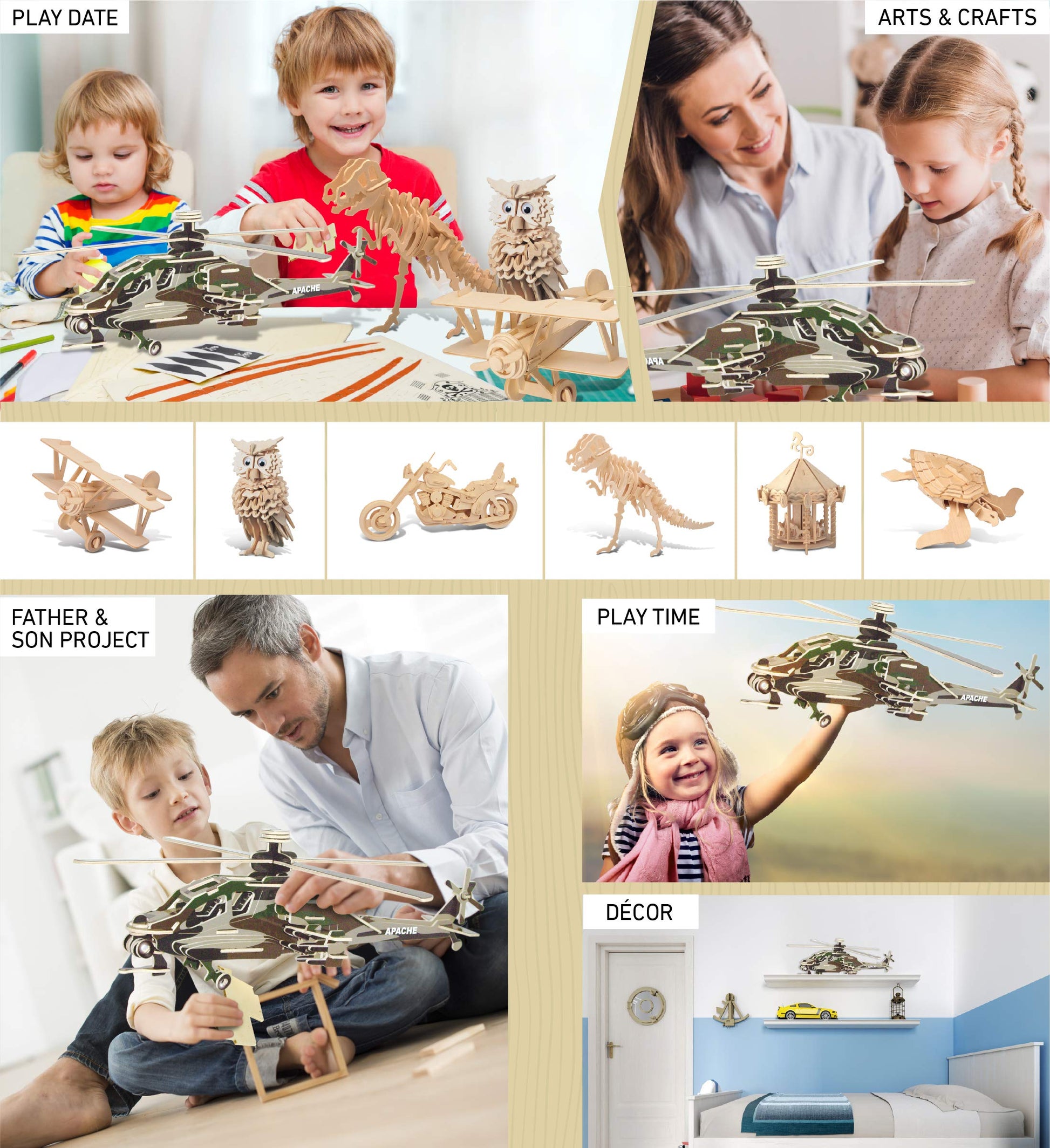 Puzzled 3D Puzzle Apache Helicopter Wood Craft Construction Model Kit, Fun Unique & Educational Diy Wooden Toy Assemble Model Un