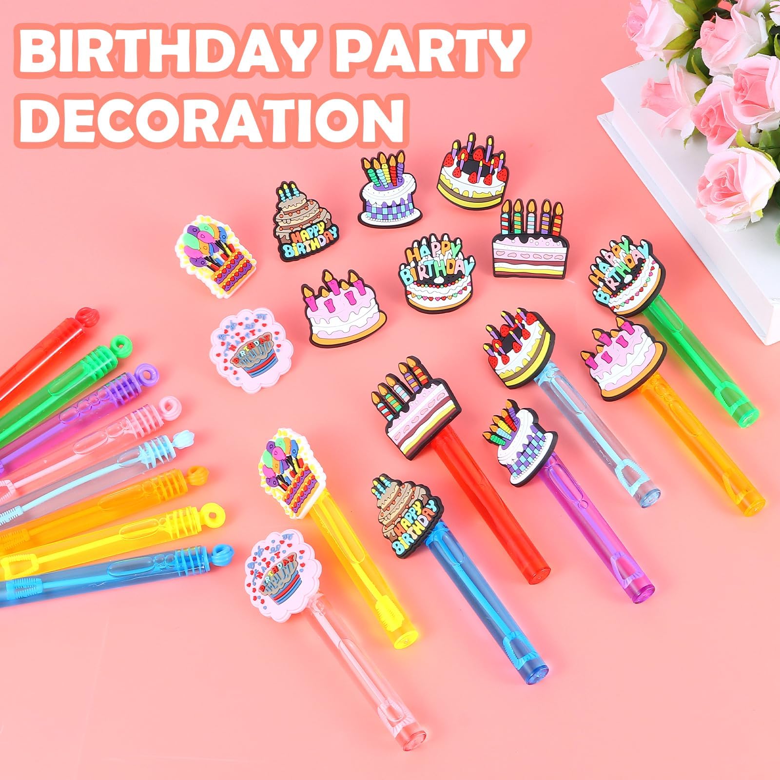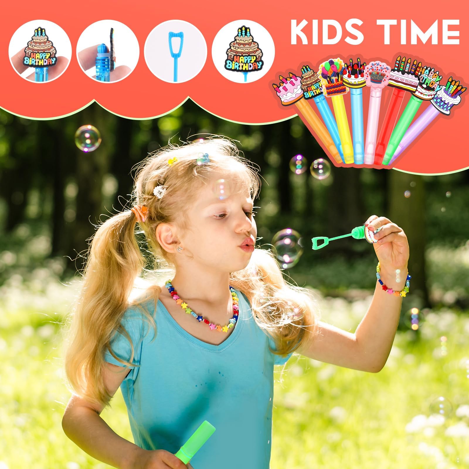 What you get: each package contains 48 pieces birthday bubbles in 8 styles,enough quantity for party favors, teacher's classrooms supplies, birthday party gifts or classroom prizes Birthday design: our mini bubble wands come in 8 different designs,6 pieces of each style,they are designed with different cake patterns,creative design styles and rich color choices can meet the discerning needs of children Safe and quality materials: the bubble wands are prefilled with non-toxic smelless soap solution,It's made of non-toxic scentless bubble solution, very safe to kids skin and face,they are the best birthday gifts for kids, choose them will make you and your family enjoy the daily happy.Recommended for small children aged 12+ year old Perfect mini size: each birthday bubble wands measures 4.8 inch, each bubble wand contains 0.2 oz bubble liquid.and can be conveniently placed in small pockets, making it easy to carry,suitable sizes are easy for your carrying and storage, please confirm the size you need before purchase Wide applications:the mini bubble wand set is a great choice for kids gifts and party decorations,and not only ideal for birthday party use, but also as a perfect gift for daily fun,party favor goodie bags, scene and decoration, parties prizes etc.,children will play for hours non-stop with these colorful bubble wands