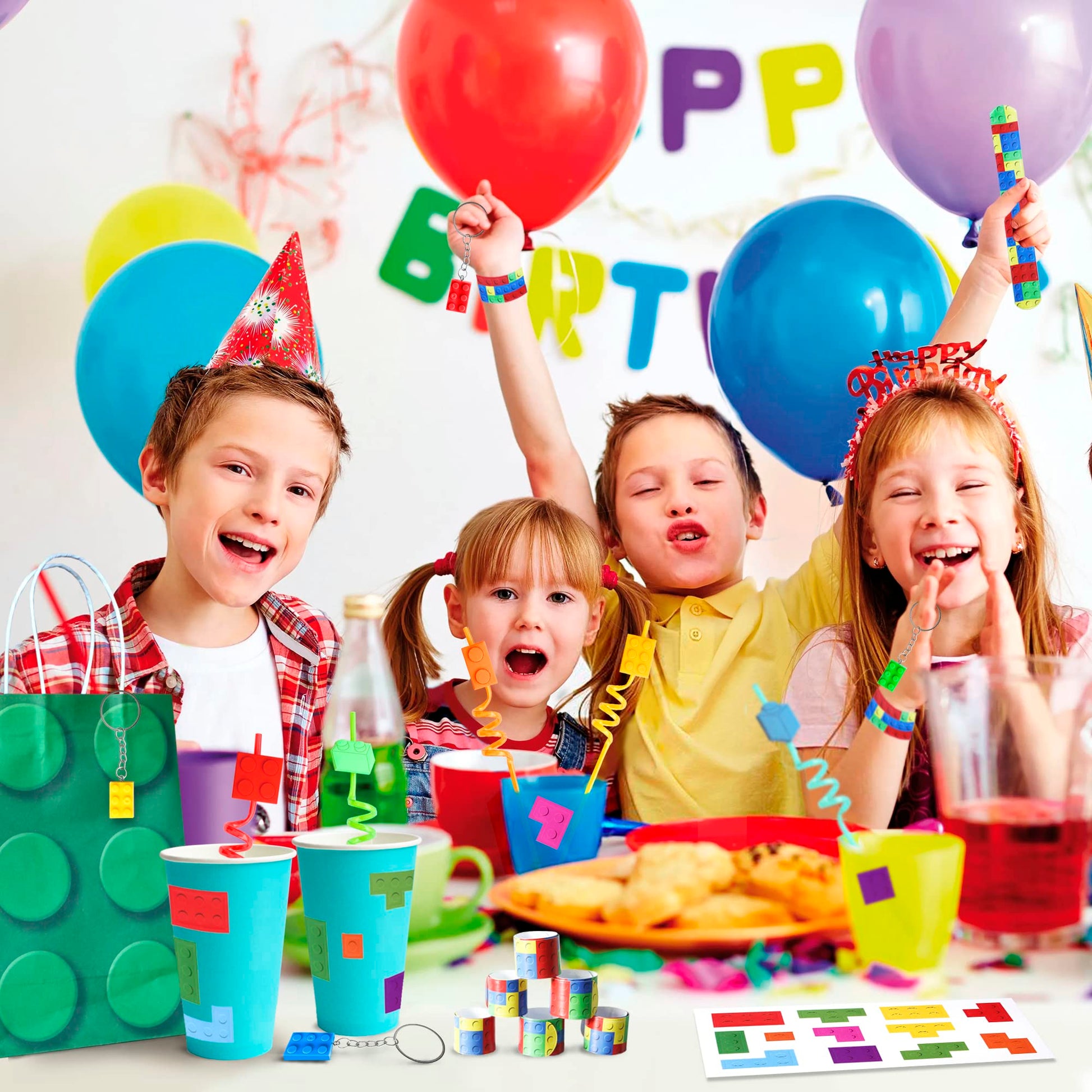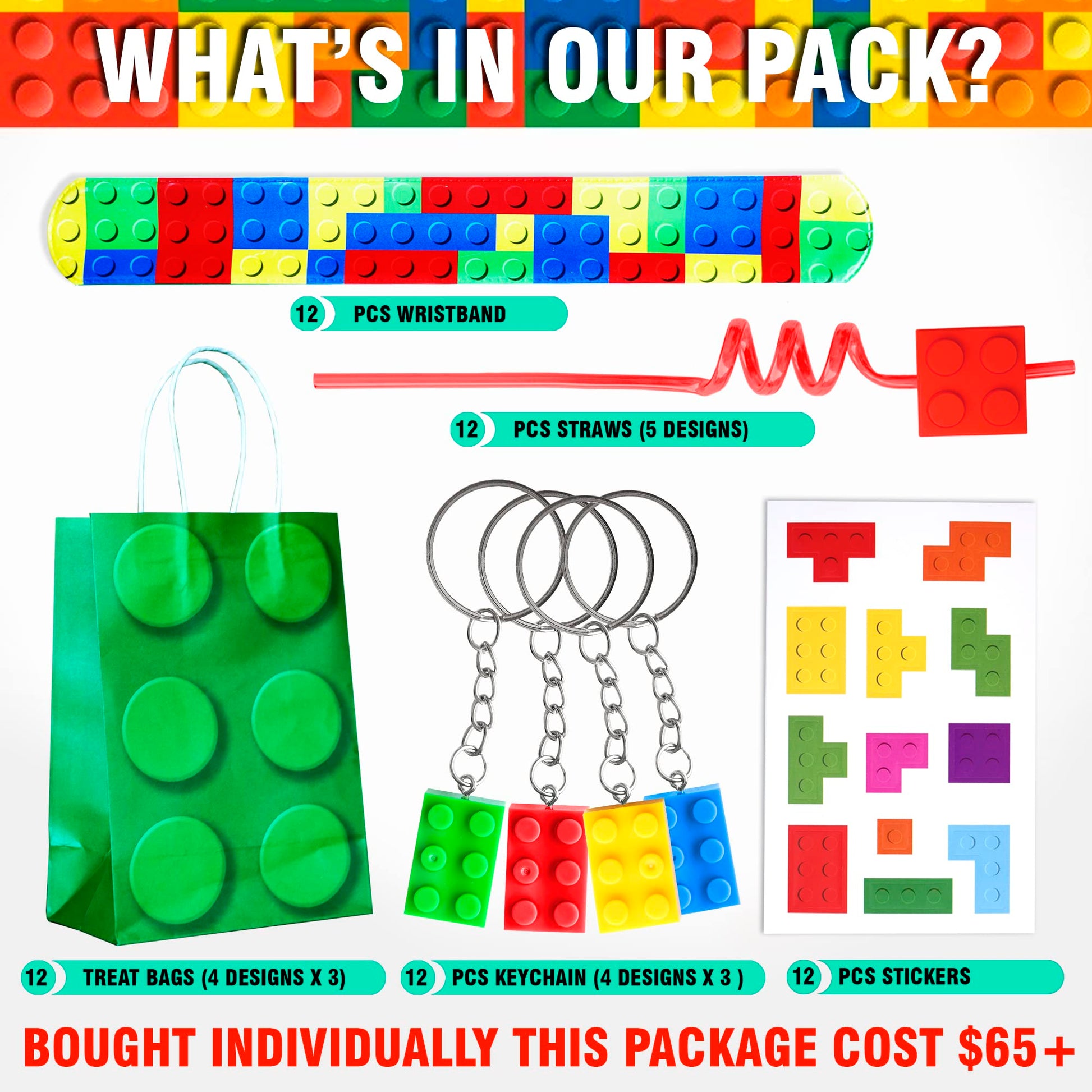 - Q: What items are included in the Building Blocks Party Favor set? A: The set includes 60 pieces in total, featuring 12 Block Style Slapbands, 12 Block Brick keychains in red and green, 12 Block Party Straws with unique designs, 12 sheets of Building Block-themed stickers, and 12 Block-themed favor bags.