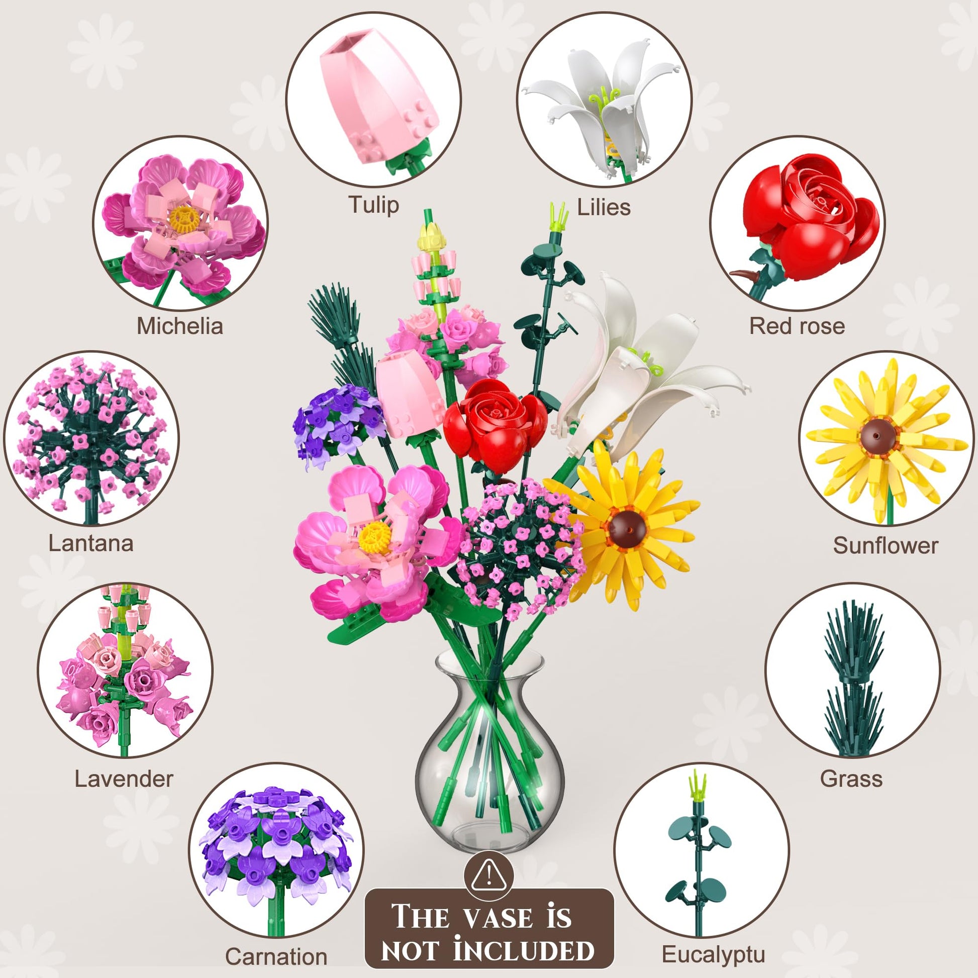 - Q: How many different flower bouquets can be created with this set? A: With this set of 699 DIY blocks, you can build 10 unique flower bouquets featuring various flowers like red roses, tulips, and sunflowers, allowing for endless creativity.