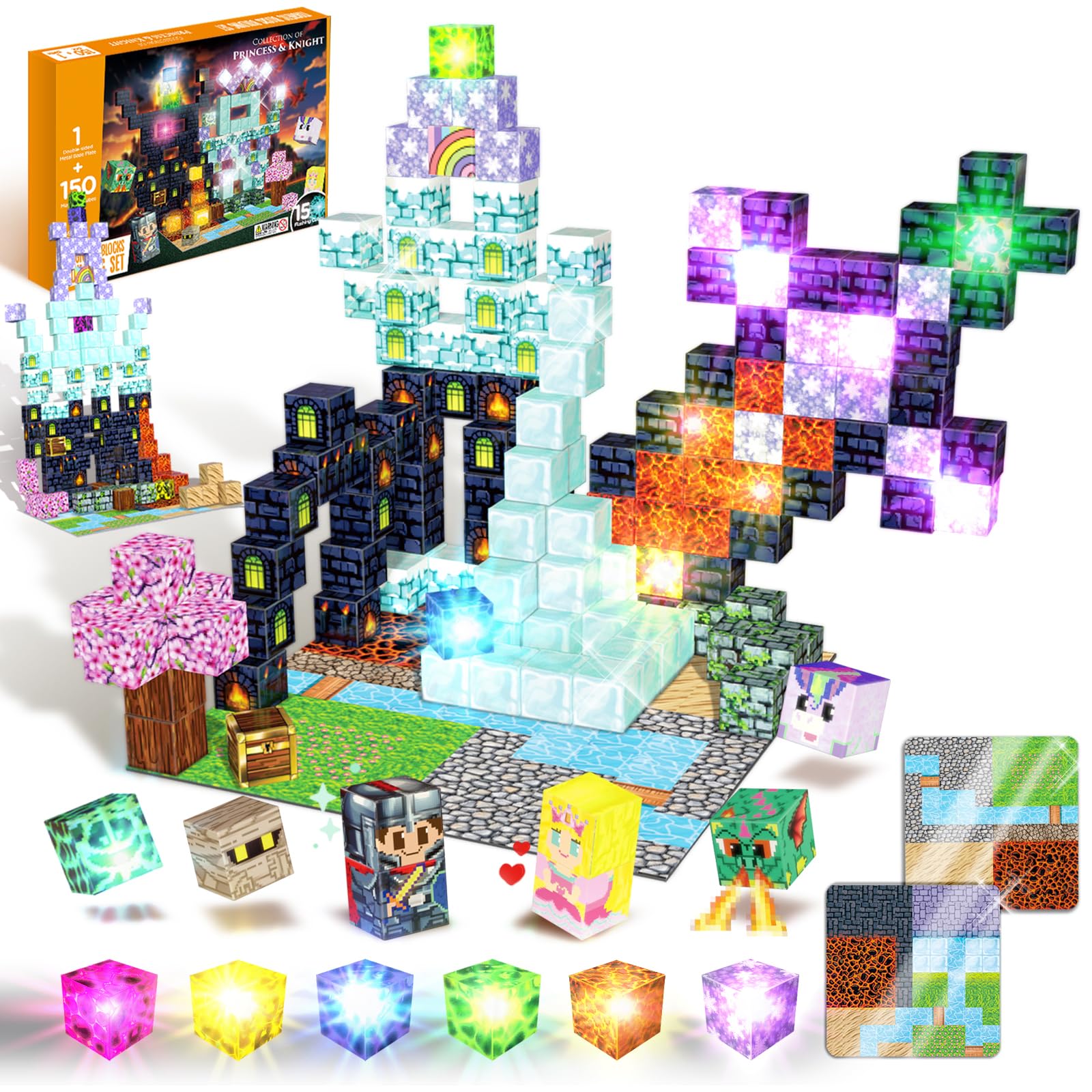 150 Pcs Magnetic Building Toys, Magnetic Building Blocks With Light, Magnetic Cubes Princess & Knight Theme Light Up, Stem Senso