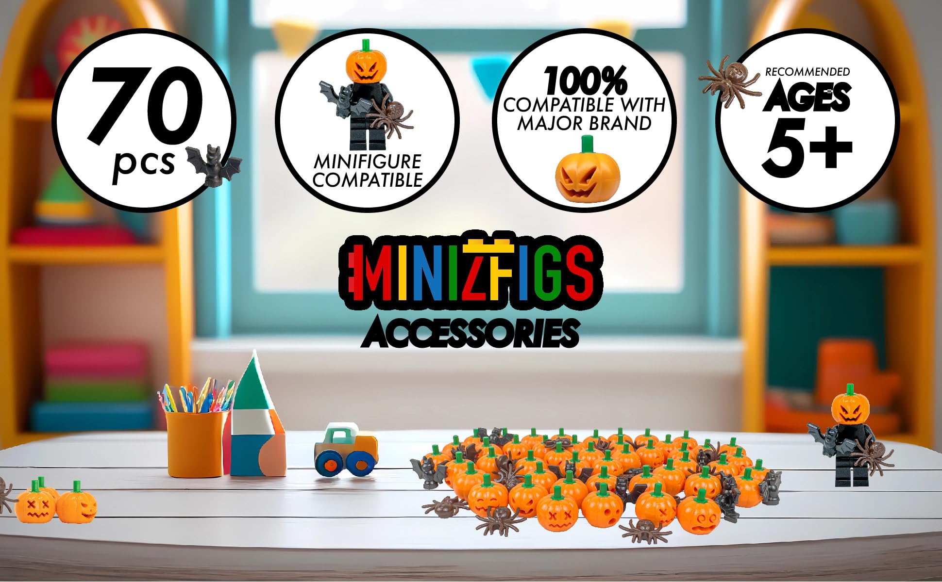 - Q: How many pieces are included in the Minizfigs Halloween Pumpkin Set? A: The set includes a total of 70 pieces, featuring 45 vibrant orange jack-o-lanterns, 10 black bats, and 15 brown spiders. This variety allows for creative building and endless fun during Halloween or Thanksgiving.