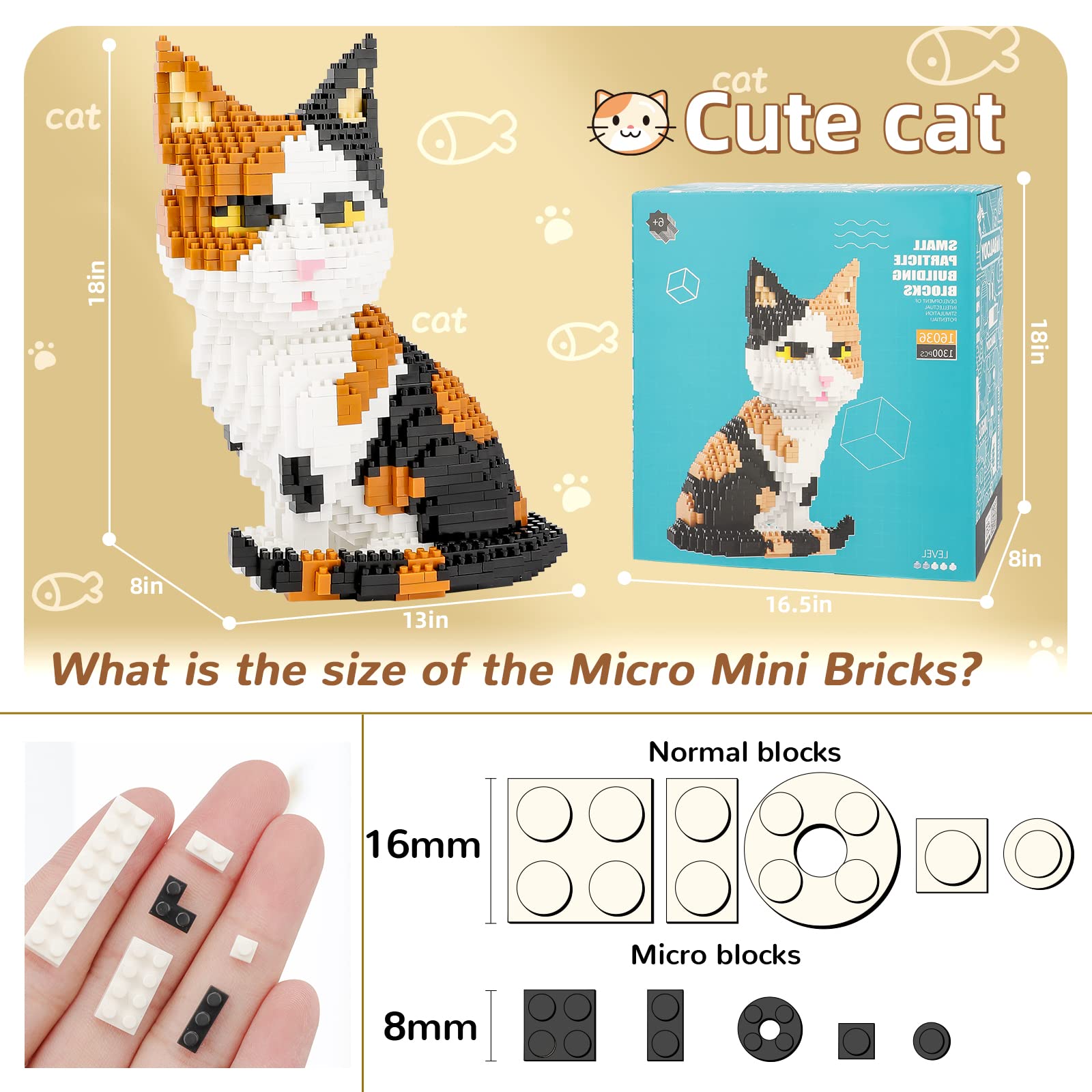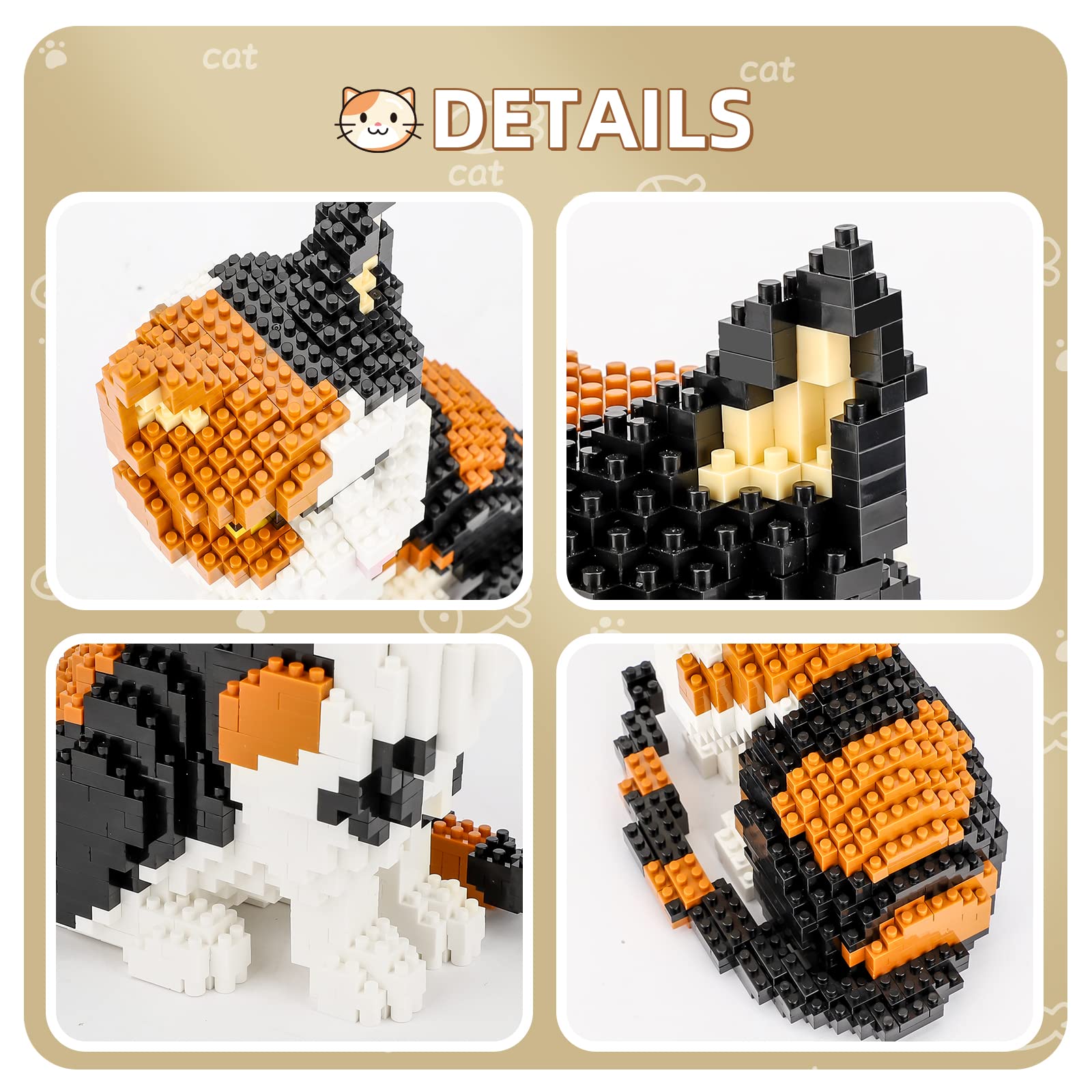 1.The Small Cat Is Made Pf 1300 Pieces Top Quality Micro Building Bricks. Compared With The Traditional Size Building Sets, This Animal Party Favors Toys For Kids Has Better Compactness, Higher Occlusion Between The Building Blocks.