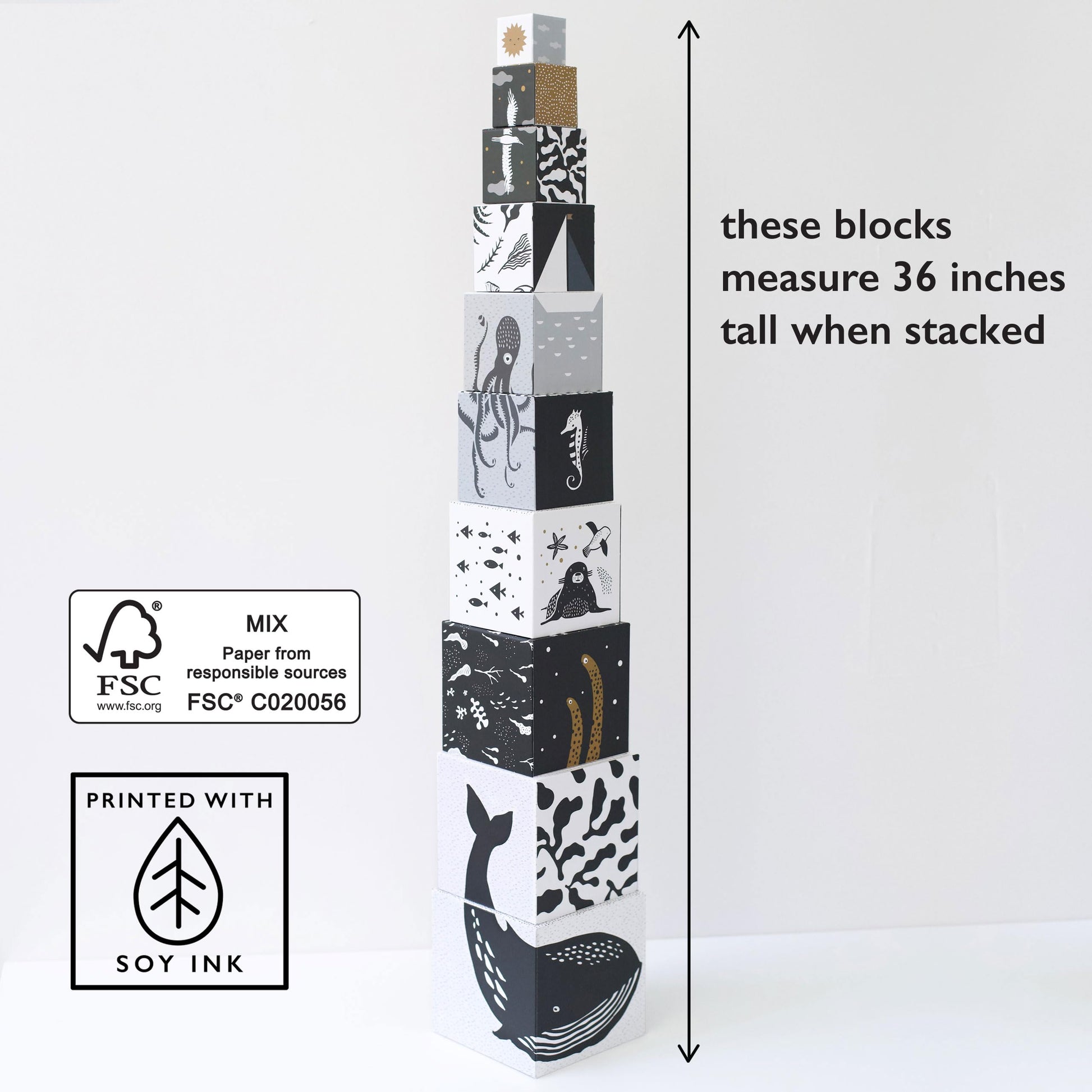 A toddler's imagination can run wild with these whimsical ocean animals Nesting Blocks. Stack and play all day, explore numbers and counting all while enjoying the high-contrast patterns and illustrations. This set contains ten blocks which will help your child learn to count numbers one through ten, and encourage understanding of early math concepts as the size of the blocks grow with higher numbers. After play, blocks can be nested back into each other by size, another valuable exercise for growing minds and hands. Problem Solving: It takes practice and balance to stack the blocks, developing motor skills. Children must solve that the biggest blocks go on the bottom and the smaller blocks are stacked on top in order to create a tall tower. Motor Skills: After balancing and stacking play, blocks can be nested back into each other by size for neat storage, another valuable exercise for growing minds and hands. Sturdy & Safe For Children & Toddlers: Ethically made with eco-friendly FSC certified paper board and printed with nontoxic soy based ink. Designed with quality materials and made to last. Blocks measure 36 inches tall when fully stacked.