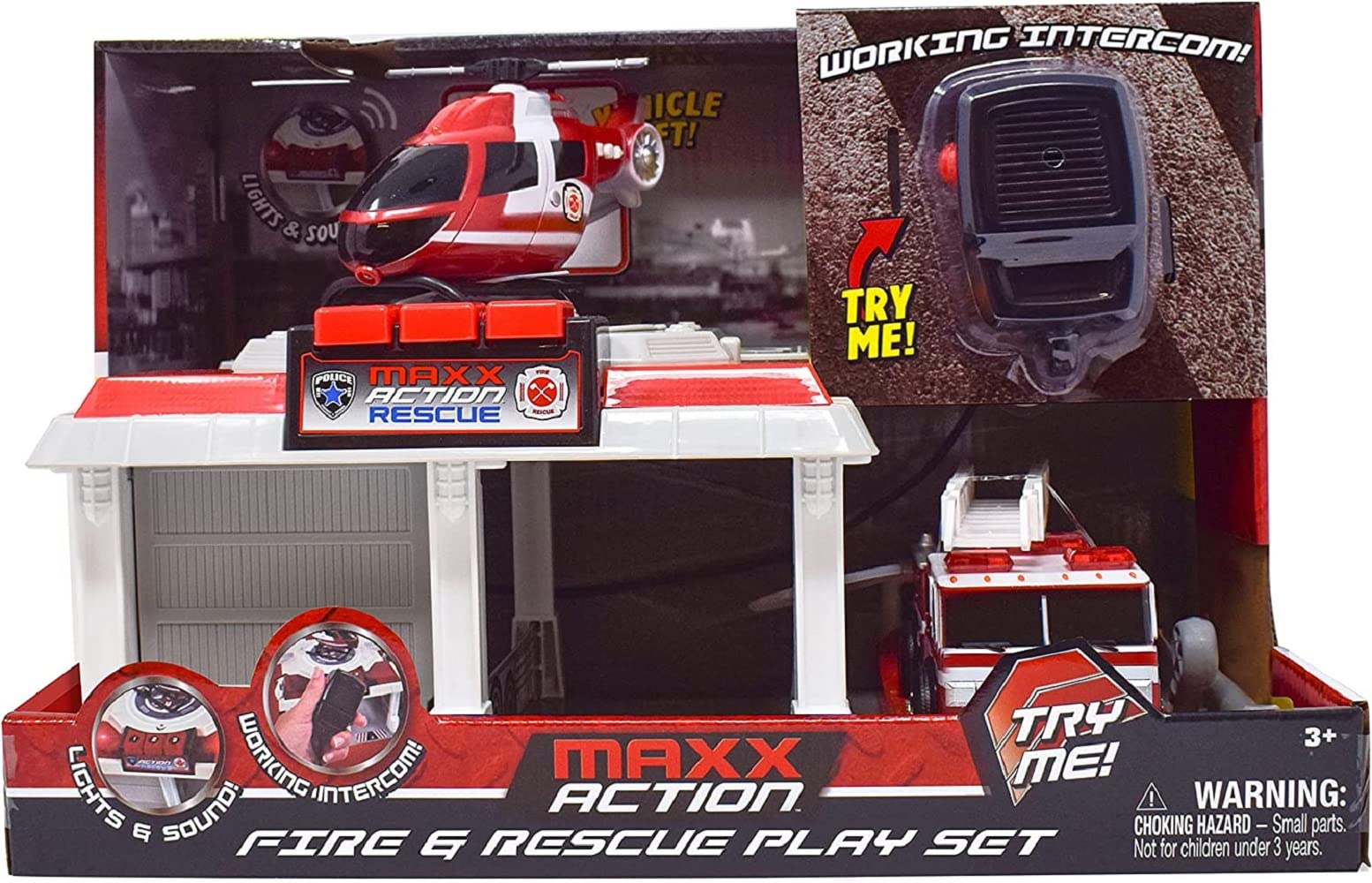 Young Firefighters Can Respond To Pretend Emergencies With The Maxx Action Fire & Rescue Garage! This Playset Provides A Multi-Level Space, Perfect For Imaginative, Storytelling Play. Featuring An Open & Close Garage, Manual Vehicle Lift And Helicopter Landing Pad, It Is A Full-Service Station Ready For Heroic Play. Push One Of Three Buttons On The Playset To Hear Different Rescue Sounds. Use The Working Intercom To Send Out Alerts To The Emergency Vehicles With Your Own Voice. Race Into Action With The Mini Helicopter And Firetruck. Each Vehicle Is Equipped With Realistic Lights & Sounds, Friction-Rev Motor And Soft Rubber Tires For Maximum Fun. After Kids Leave The Station, The Helicopter Can Make An Emergency Landing With Medical Air Lift. Once They Arrive On Scene Kids Can Extend And Swivel The Ladder Over To Rescue Their Toys From Danger!