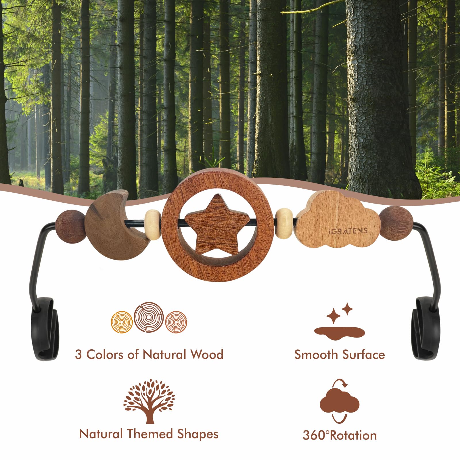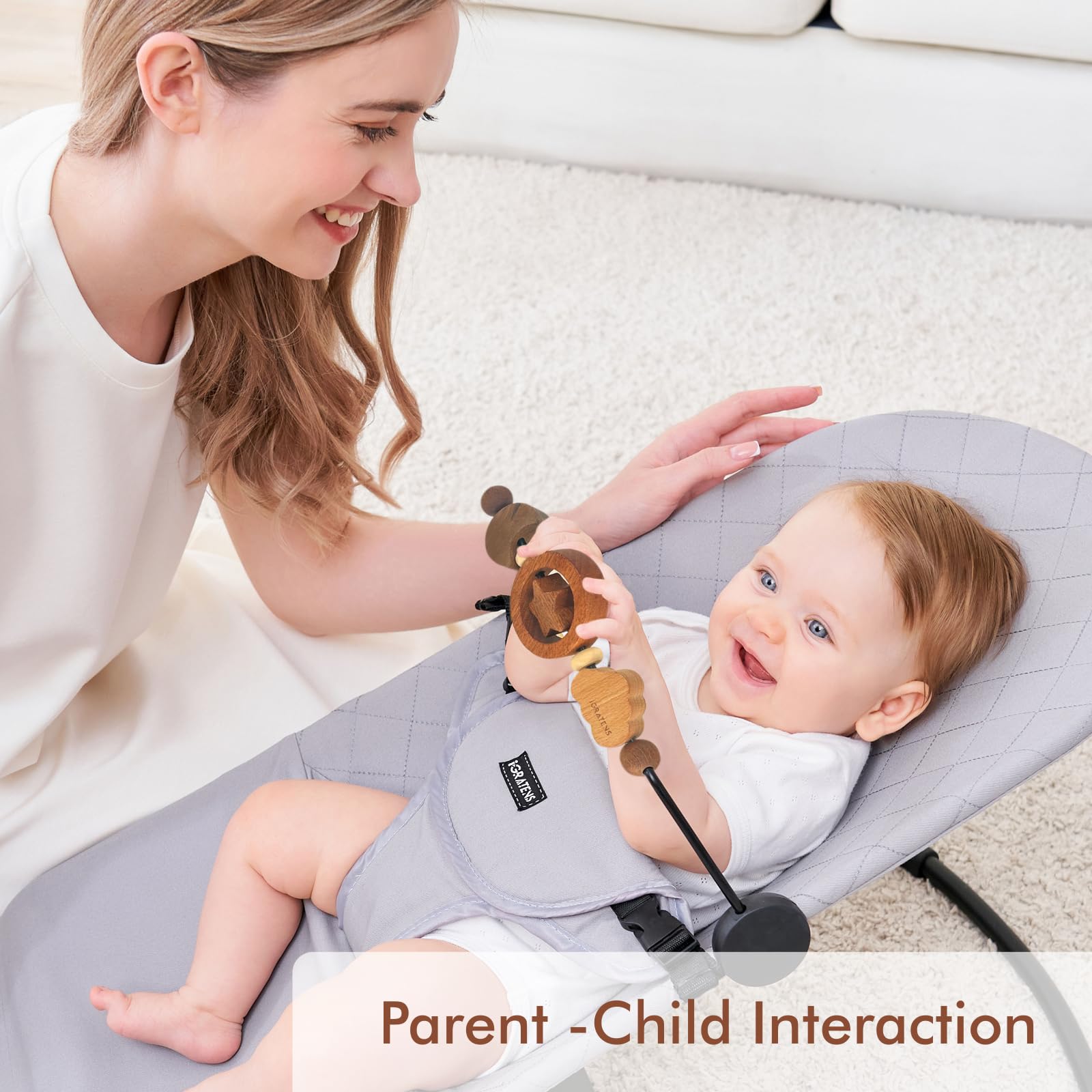 Product name: Baby Bouncer Toy Bar Applicable age: 0+ Brand: iGRATENS Material: WOOD/Plastic Color: Natural wood Educational purpose: Promote fine motor skills and hand-eye coordination for babies, toy bar for baby bouncer