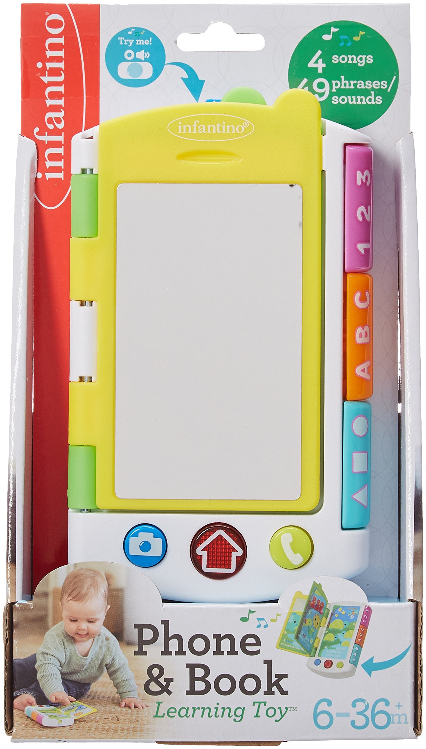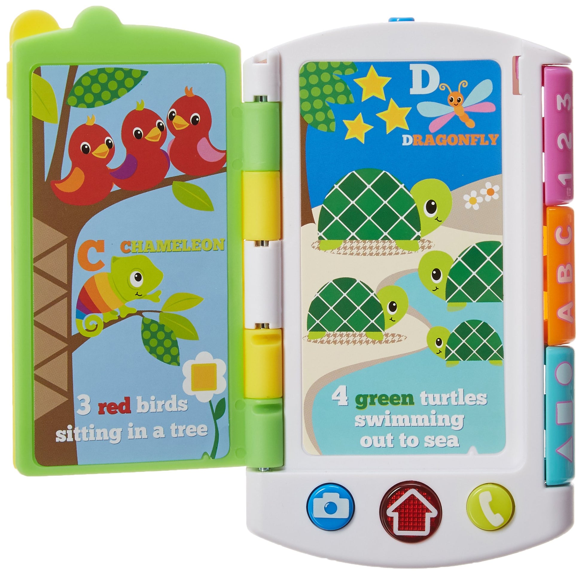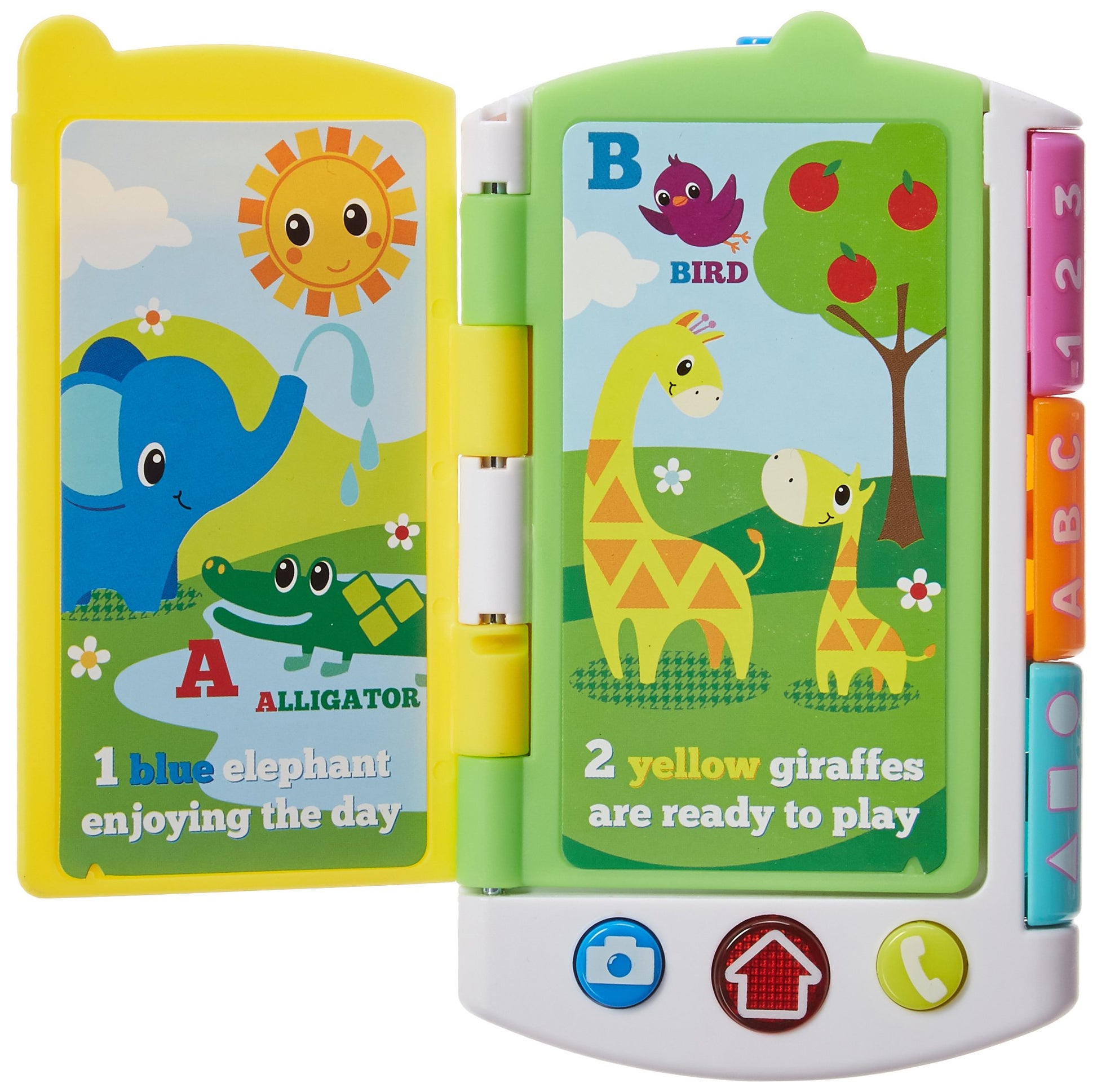 This fun phone book is filled with surprises. A large mirror and interactive buttons on the front are prefect for imaginative phone play. Make a call or take a picture. Open the phone book pages to activate learning content, as the phone reads a simple story and prompts children to discover shapes, colors and numbers. Features 4 original songs, 43 encouraging phrases and 6 fun sound effects.