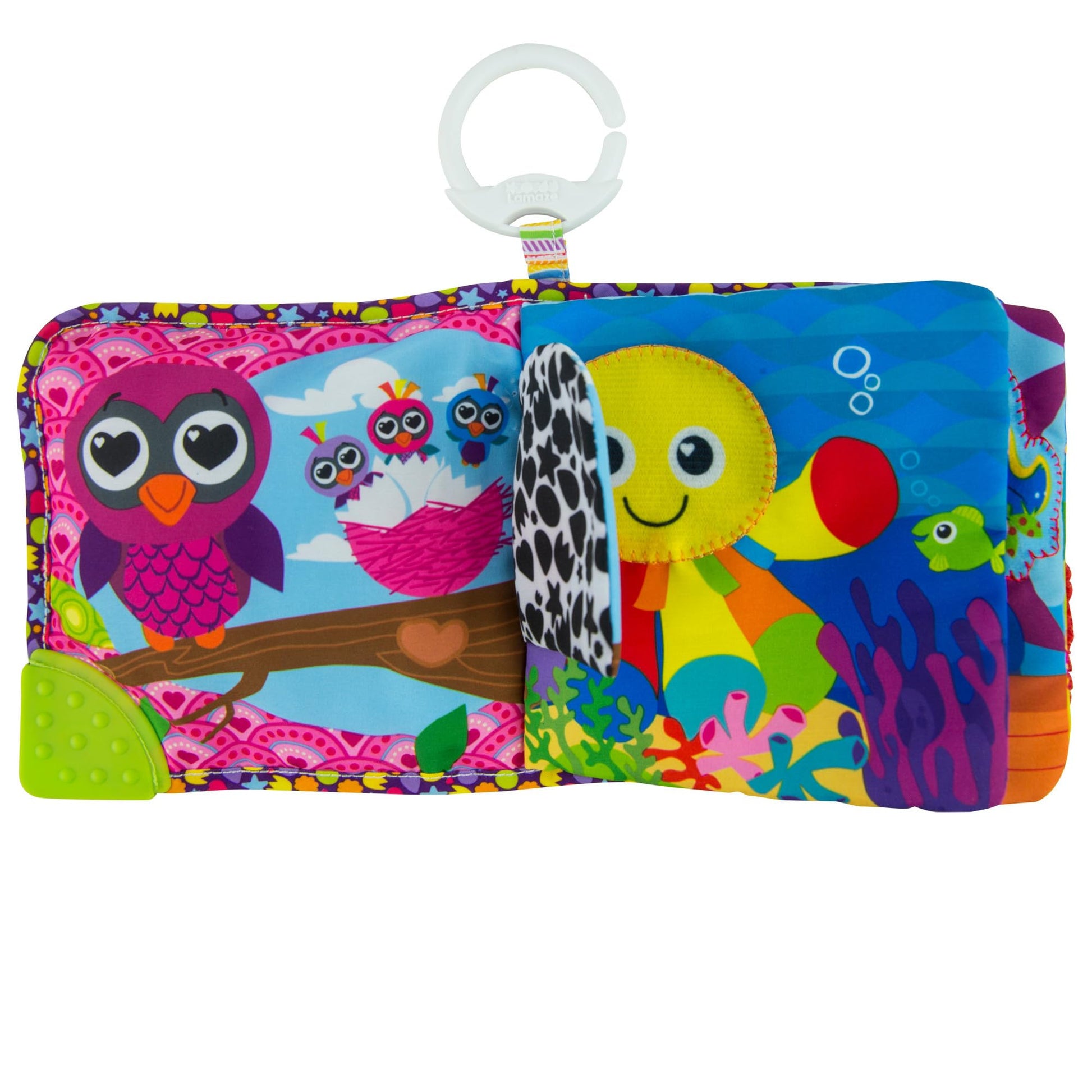 A great choice for babys first book, the Lamaze Fun with Feelings Soft Book features colorful characters for you and baby to bond over during story time. The interactive soft pages provide visual stimulation with a discovery mirror and bright colors for baby to explore. Squeaker, rattle, and crinkle sounds engage baby as they discover something new on each page. Lifting the crinkly flaps reveals hidden surprises. Gripping and grabbing the soft cloth pages and interacting with the different textures helps with development of tactile and fine motor skills. Textured corners are designed with chewing in mind, so baby can explore with mouth as well as hands. The included Lamaze clip lets you take this discovery book on the go, hooking easily to strollers, carriers, and diaper bags. Lamaze soft books are full of engaging content designed to make it fun for babies and toddlers as they discover, learn, and grow. This clip-on sensory book from Lamaze baby toys is the perfect baby toy for infants ages 6 months and up.