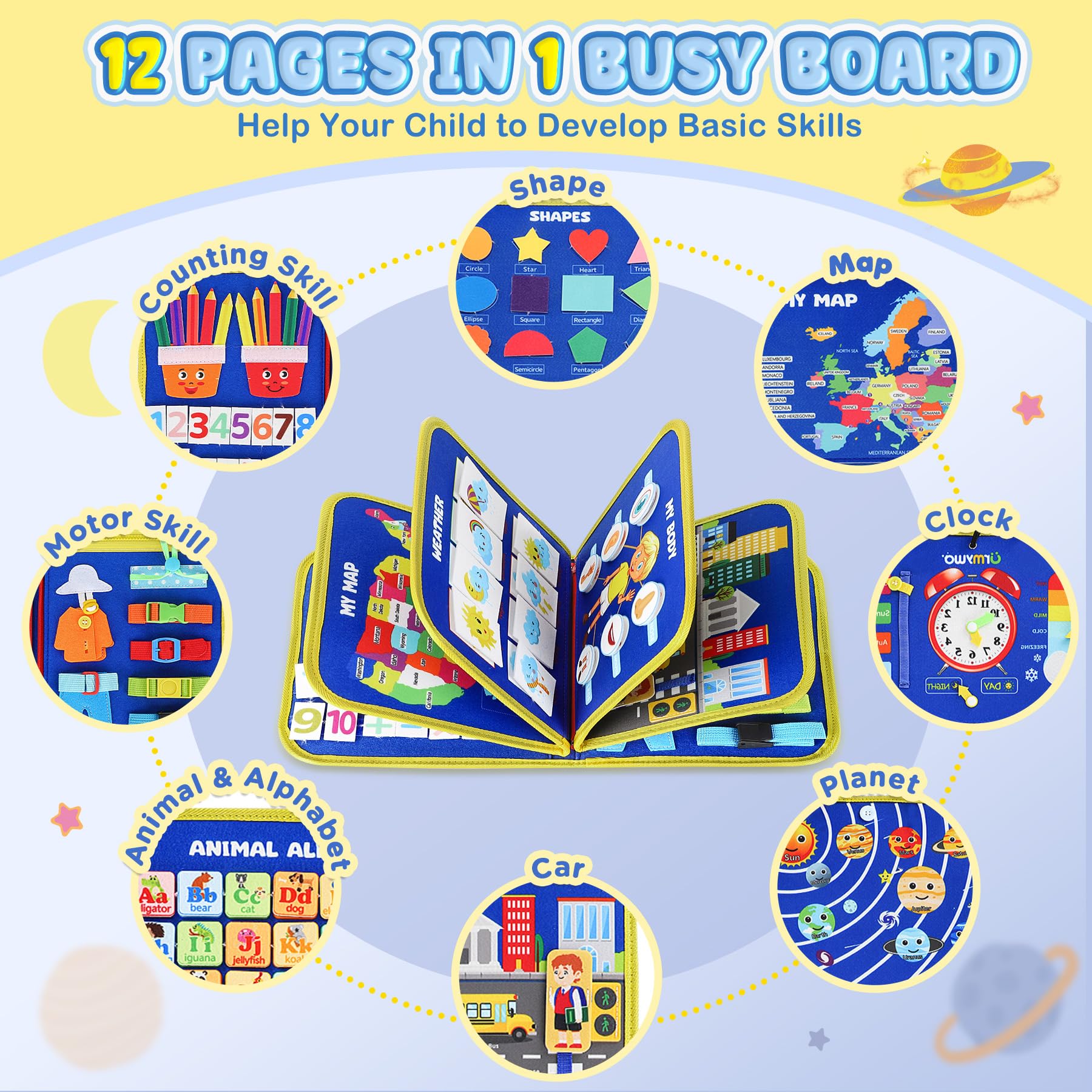 - Q: What activities are included in the busy board? A: The busy board features 12 engaging pages with activities such as zippers, buttons, belt buckles, clocks, and various learning themes like letters, numbers, shapes, and planets, providing hours of fun and learning.