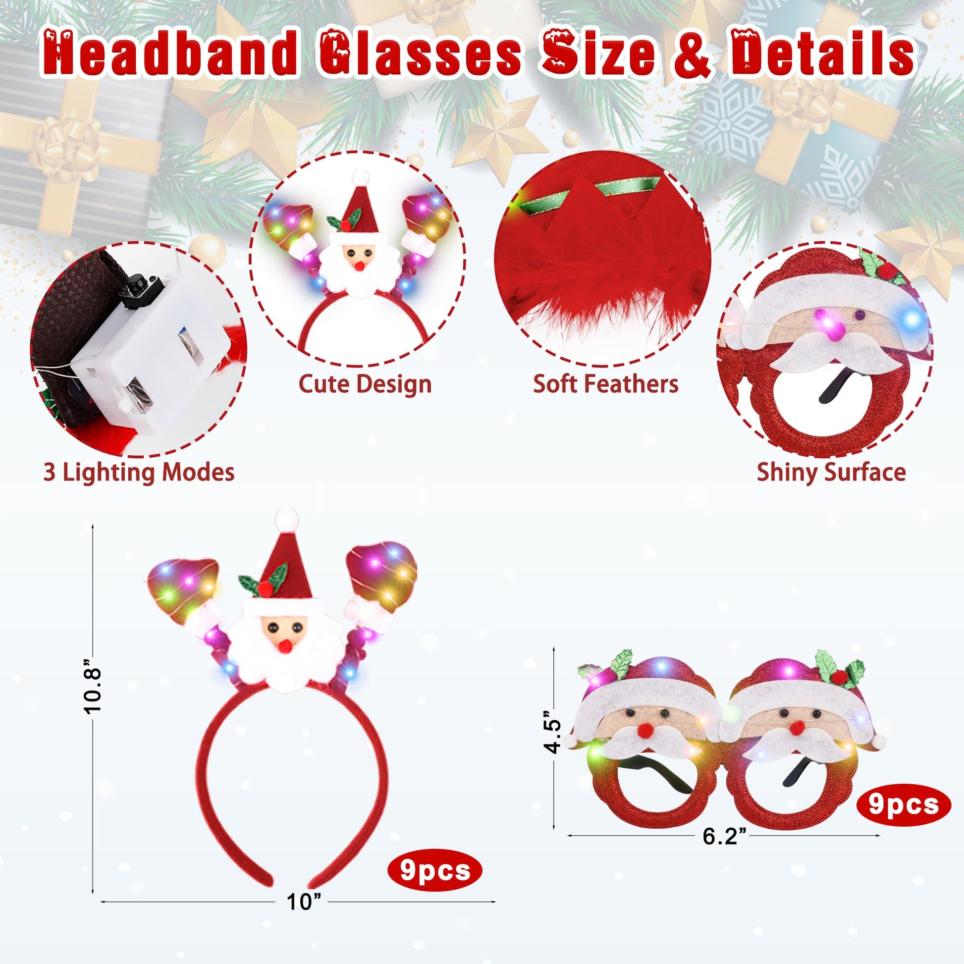 27 PCS Christmas Party Favors, Light Up Xmas Necklace Headband Glasses Set, Xmas Bulb Necklace Antler Lights Headbands LED Flash