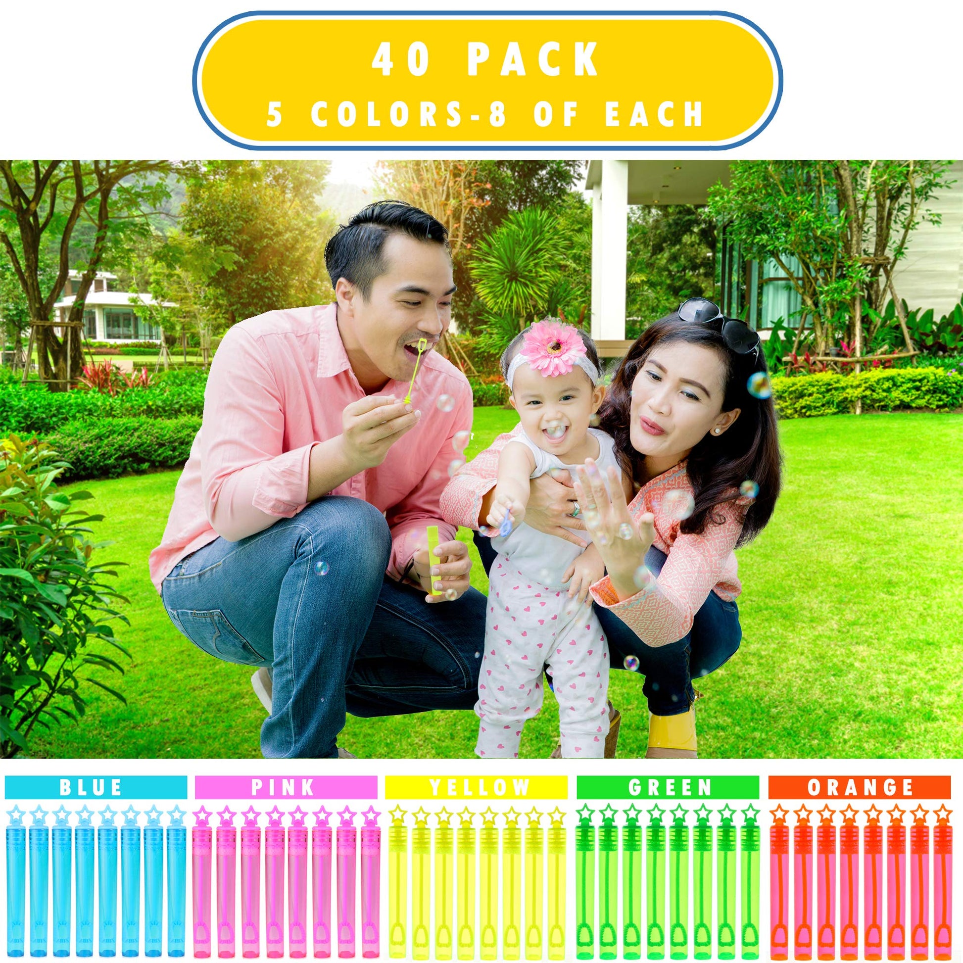 This Bulk Pack Of Mini Bubble Star Wands Is The #1 Party Favor! They Are Perfect For Birthday Parties, Neon Themed Parties, Carnival Prizes Or Just Outdoor Fun. The Pack Contains 40 4 Bubble Tubes, 8 Of Each Color. The Tubes Are Pre-Filled With 0.16-Oz. Of Non-Toxic Bubble Soap. Use These In The Summer Days And Be Entertained For Hours. You Can Even Take Them Along With You On Trips/ Vacation With The Convenient Handle Attached To The Plastic Bucket.