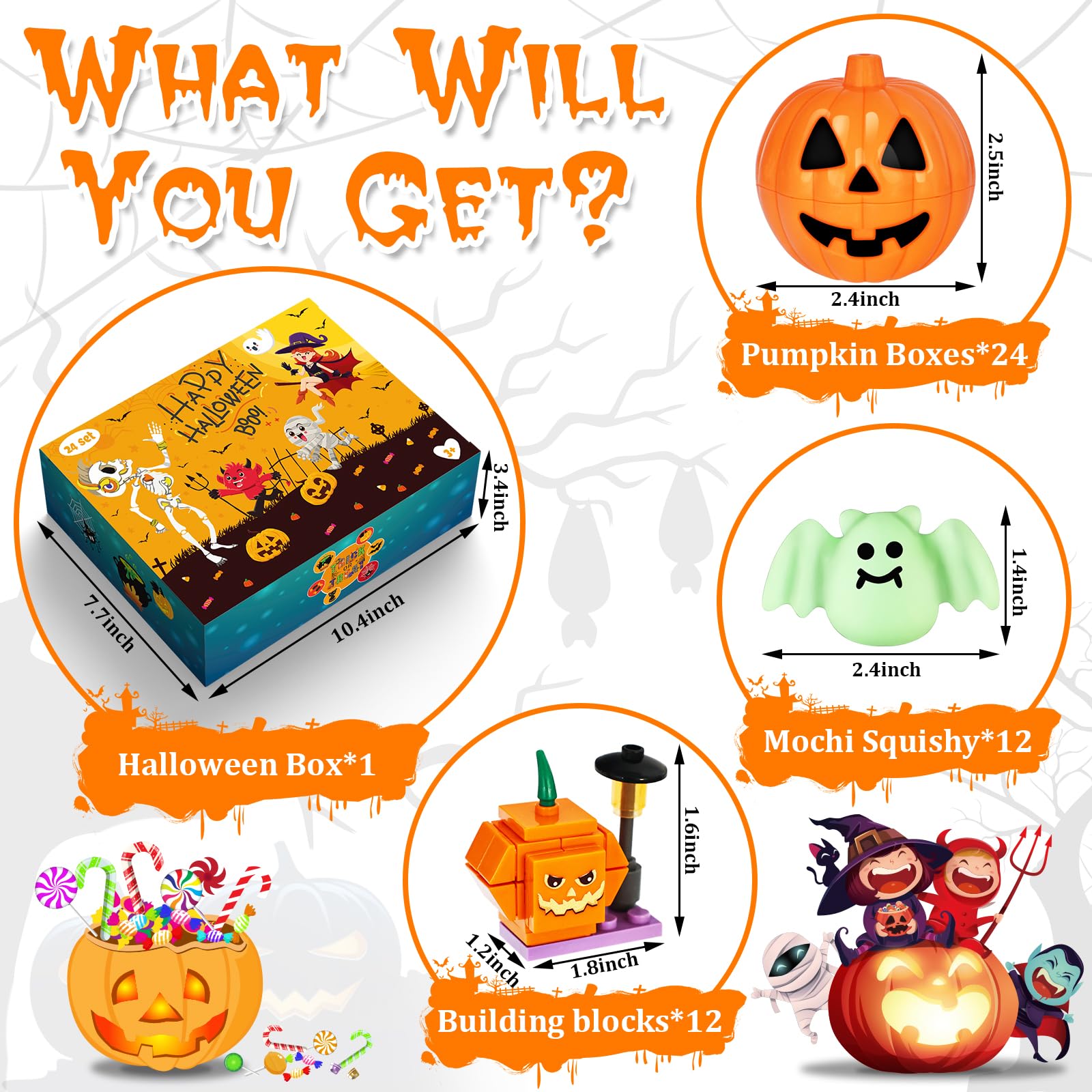 Adisher Halloween Party Favors,12Pcs Mochi Squishy 12Pcs Halloween Building Blocks and 24Pcs Pumpkin Boxes, Halloween Goodie Bag