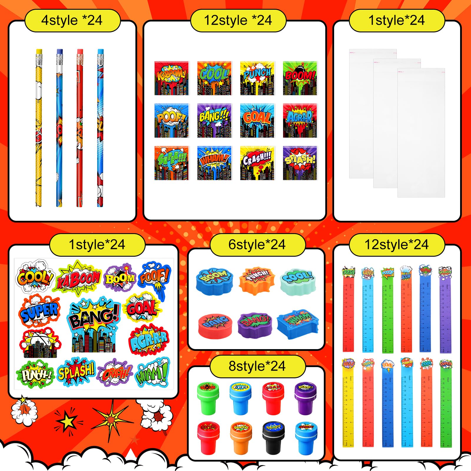Cholemy 168 Pcs Hero Party Favor Set Include Hero Birthday Mini Notebook Hero Theme Sticker Pencil Stamper Ruler Eraser for Hero