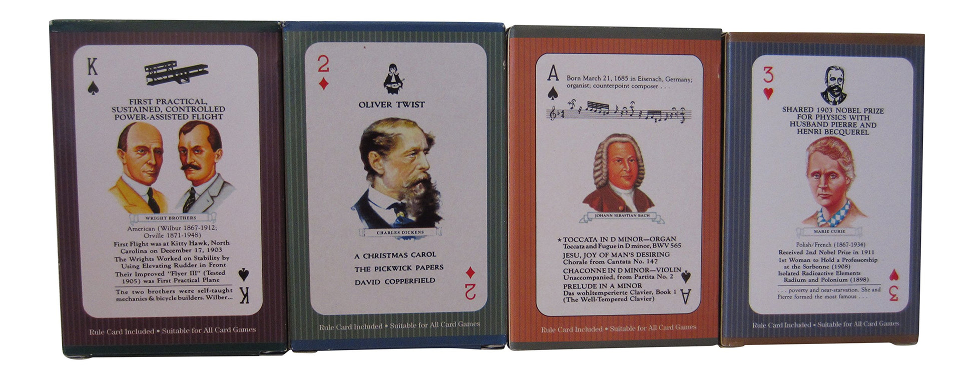 - Q: Can I use these cards for educational purposes? A: Absolutely! Each deck features color portraits and highlights the achievements of notable figures in their respective fields. This makes them an excellent educational tool for learning about inventors, composers, scientists, and authors while playing games.