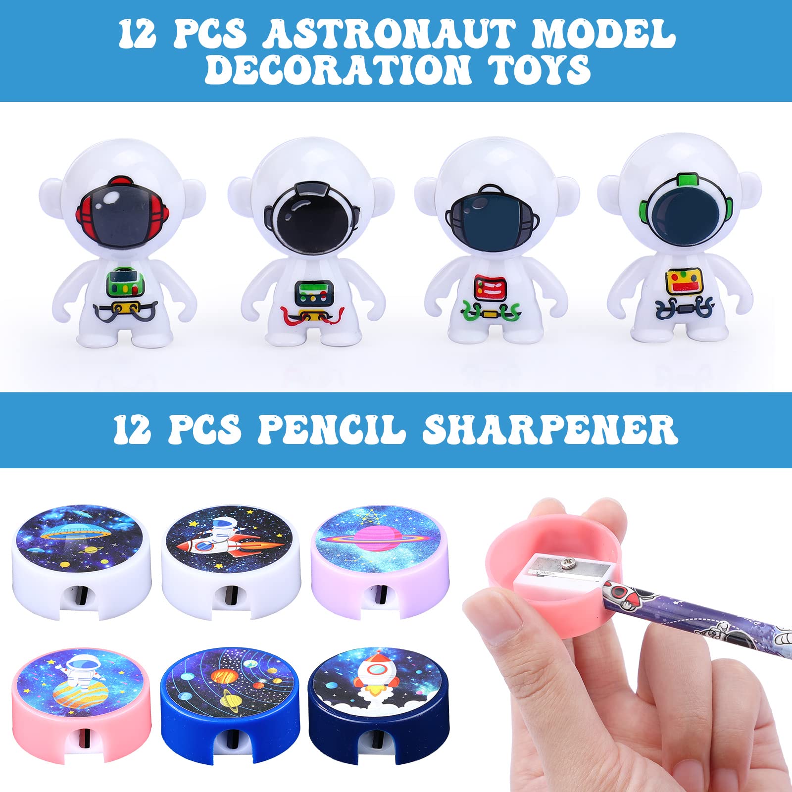 Features: Ideal Gift: these space party favors are nice for kids to use at school, can be applied as school classroom reward gift prizes supplies, and they are also suitable for sharing with little ones at your space themed party. Exquisite Design: our astronaut party supplies are carefully designed, integrating astronauts, planets, sun, moon, aliens and other elements, which can instantly take your children to space, our space party favors will make your astronaut birthday parties are very popular. Specifications: Material: Paper and PlasticColor: Please see the picture detailsQuantity: 86 SetsSizeNotepads: 2.36 x 3.94 inch/ 6 x 10 cmPencils: 7.1 inch/ 18 cmStampers: 1.4 x 1 inch/ 3.5 x 2.5 cmPencil sharpener: 1.4 inch/ 3.5 cmGift bags: 8.7 x 3.5 inch/ 22 x 9 cmStickers: 1.4 x 1.6 inch/ 3.5 x 4 cmPackage includes: 12 x Notepads12 x Pencils12 x Stampers12 x Pencil sharpener12 x Astronaut model decoration toys12 x Gift bags12 x Irregular stickers2 x Round stickersNotes: The colors may exist slight differences due to different screens.Manual measurement, please allow slight errors on size.