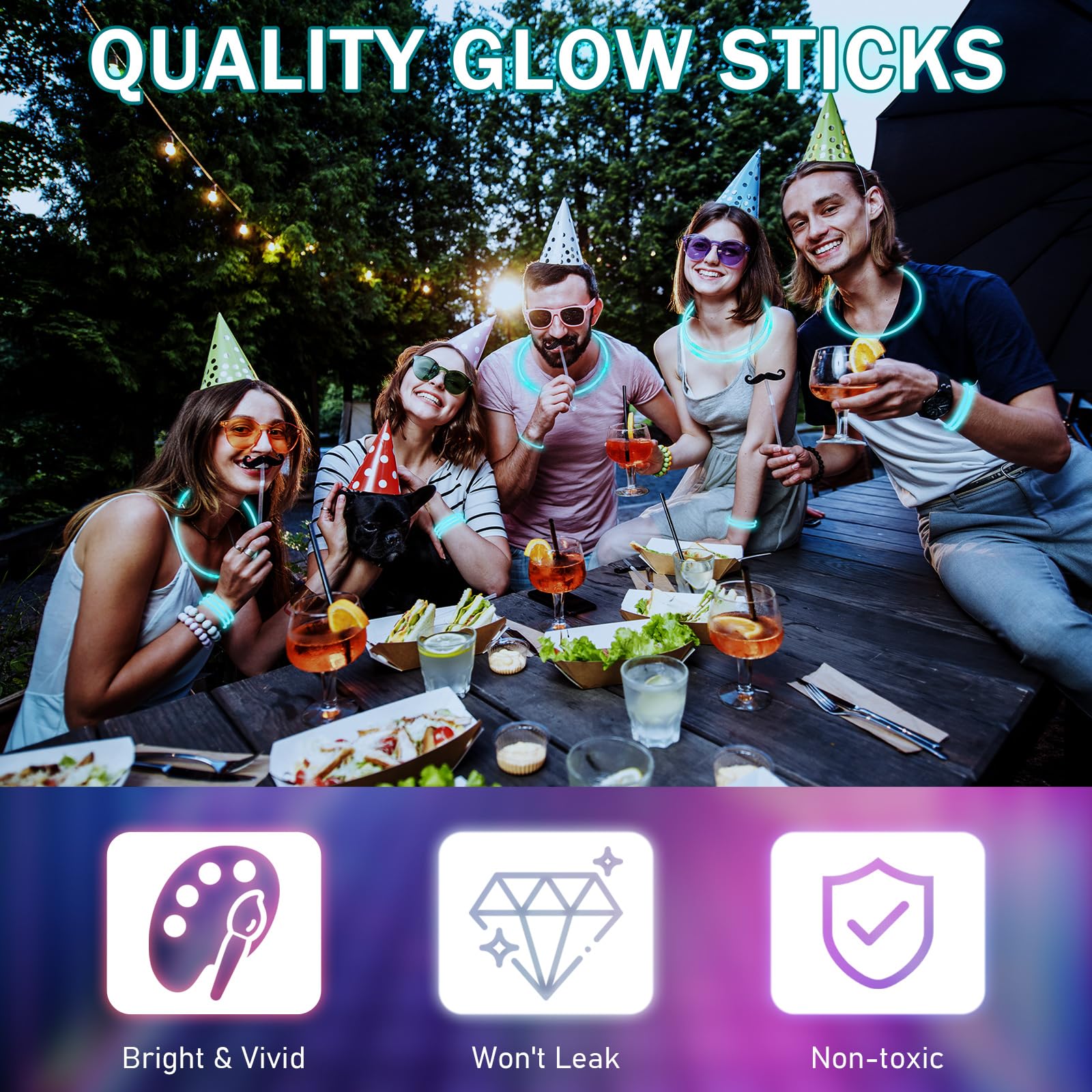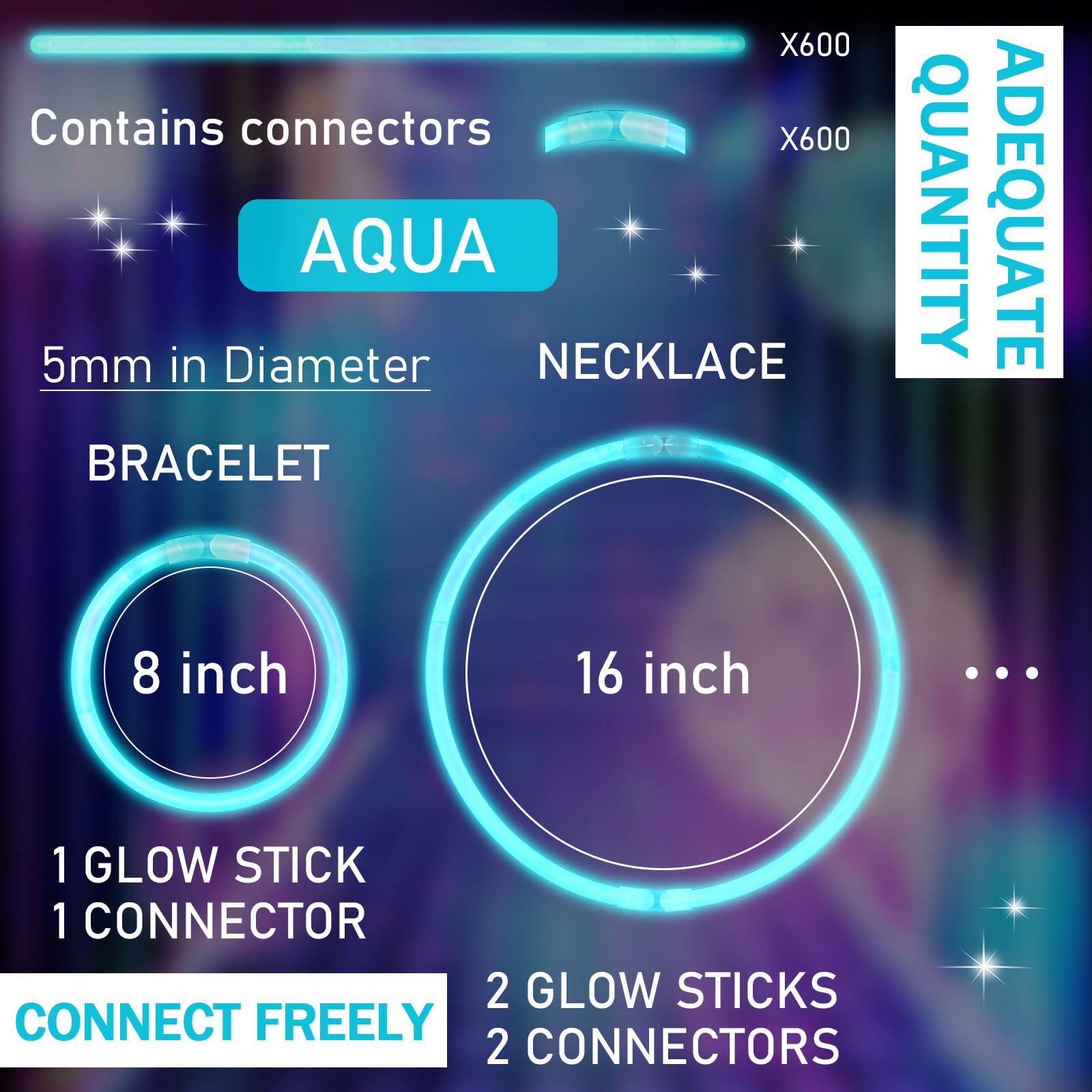 Features: The neon glow sticks are nice gifts for your friends, neighbors, relatives, colleagues or other people at the housewarming party, birthday, New Year and other meaningful occasions, which will bring a lot of fun to them. These blue glow sticks for wedding are made of quality material and will glow for around 6-8 hours, so you can enjoy your party all night long without worrying about them fading, bringing you a nice using experience. Specifications: Material: qualityColor: teal Size: about 8 x 0.2 inches/ 20 x 0.5 cmPackage includes: 300 x Blue glow sticks with connectorsNotes: Manual measurement, please allow slight errors on size. The color may exist a slight difference due to different screen displays. The glow stick contains liquid, so you need to use it reasonably, do not bend the glow stick excessively to avoid liquid leakage. Because of the machine loading, the number of glow sticks in a bucket is about 100, which may have an error of about 3.