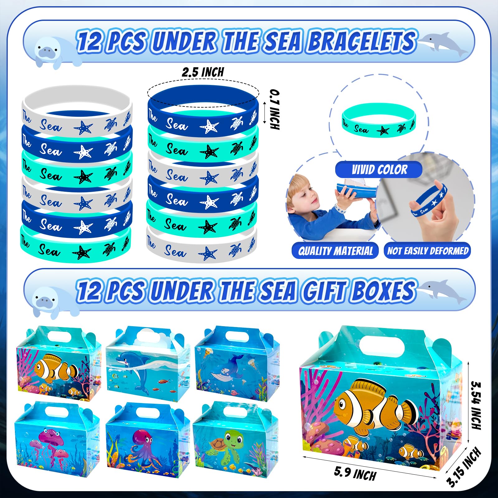 144 Pcs Under the Sea Party Favors Set with Keychains Slap Bracelet Scratch Art Tattoo Stickers Wristbands Treat Boxes Ocean Party Favors Under the Sea Party DecorationsPackage Includes:Sea Animal Keychain 12;Sea Animal Slap Bracelet 12;Sea Animal Rubber Wristband 12Sea Animal Scratch Art Kit 12;Sea Animal Tattoo Sticker 12;Grow in Water Sea Animal 12;Sea Animal Sticker 60;Sea Animal Treat Box 12;Unique under the sea party favors:Filled with cool sea animal elements which match well with your under the sea birthday party decorations and ocean party decorations,children must be very excited when they receive this gifts.Safe material:All of our products have been carefully selected.All accessories are harmless to children, please feel free to use.Dont miss our under the sea party supplies if youre going to hold a under the sea party.Let kids enjoy a nice birthday party with their partners.Warm notes:Please allow a little error on the size due to manual measurement.The color might have a slight difference due to different displays.