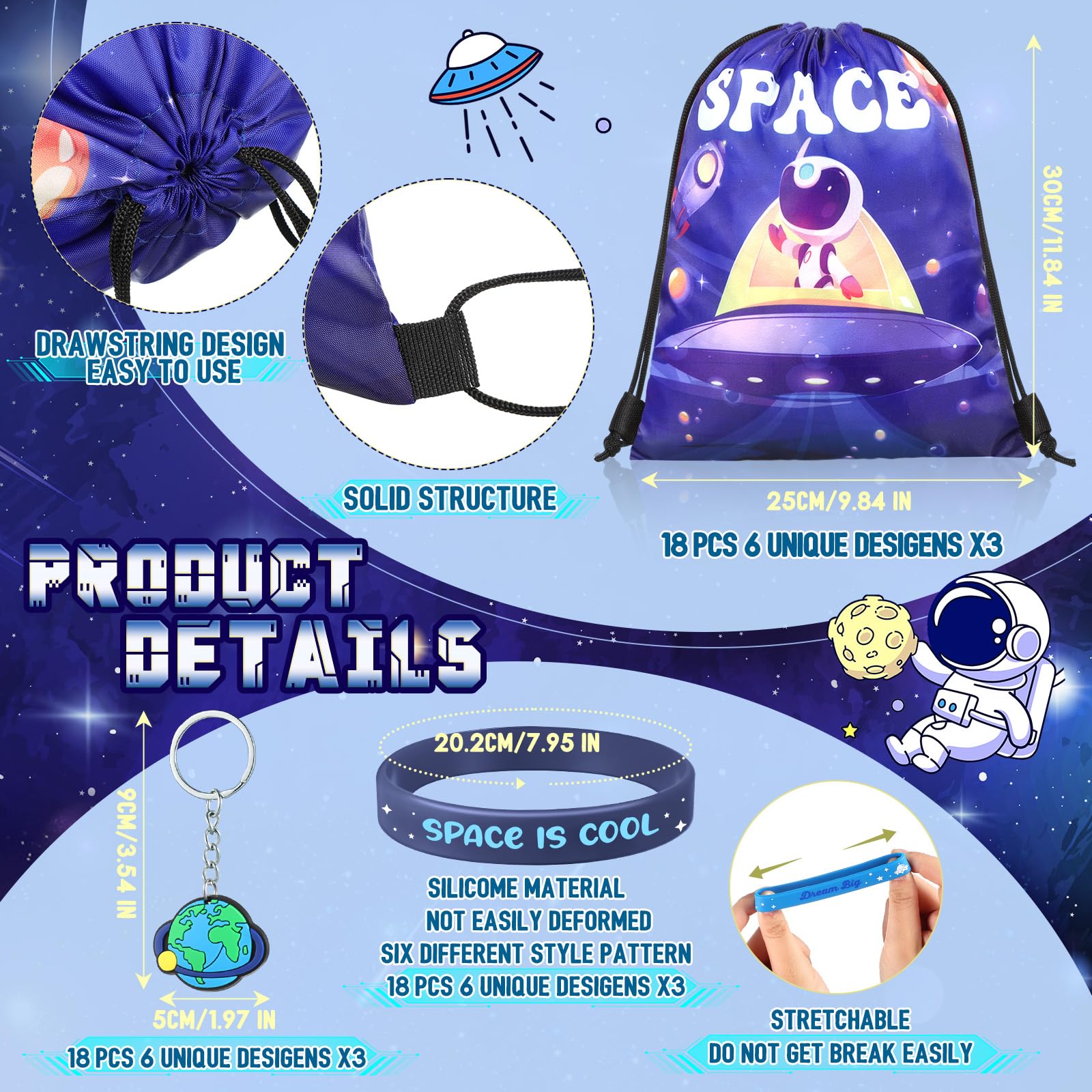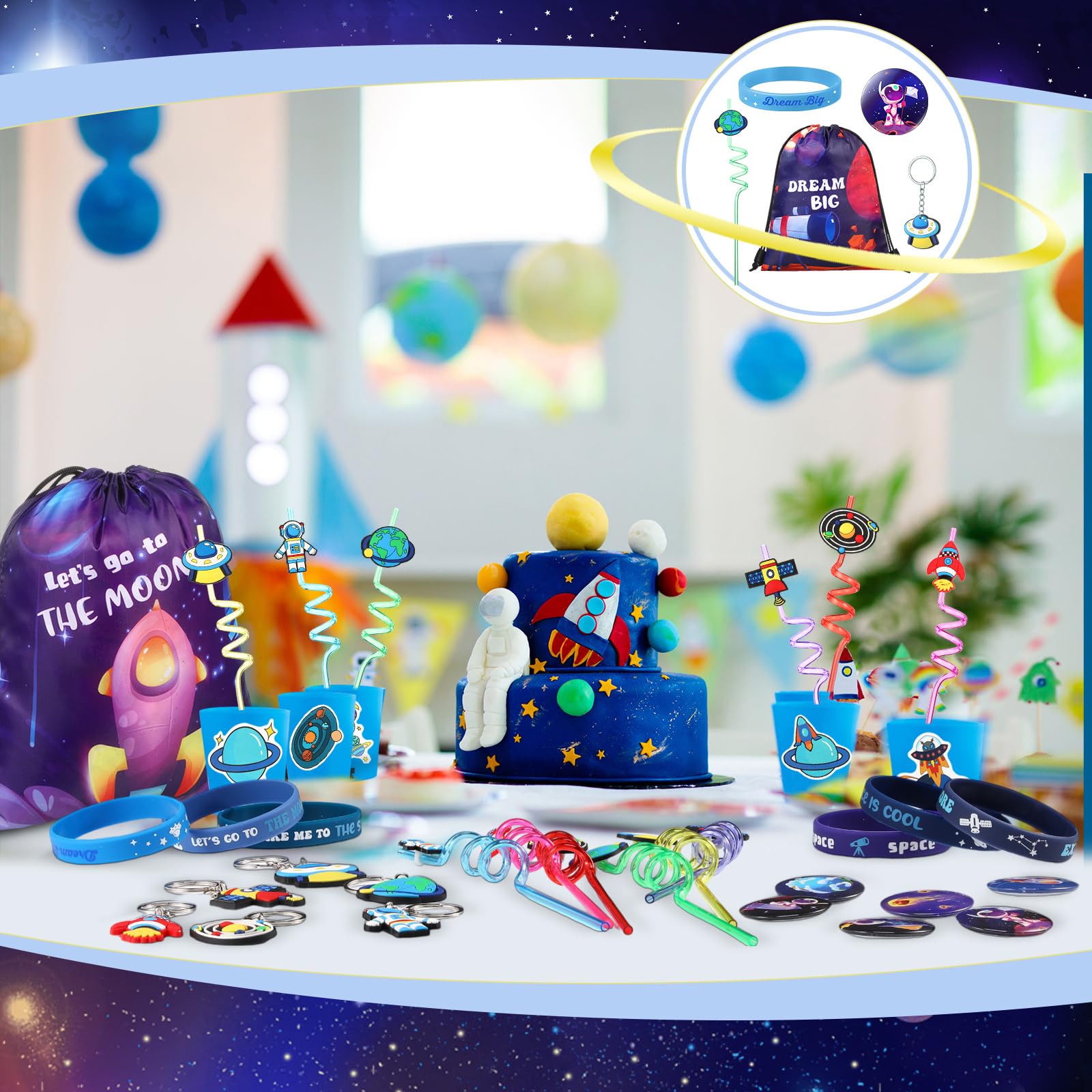 Sadnyy 140 Pcs Space Party Favors Outer Space Gift Bulk Galaxy Drawstring Backpack with Silicone Bracelet Straws Keychains Pin B