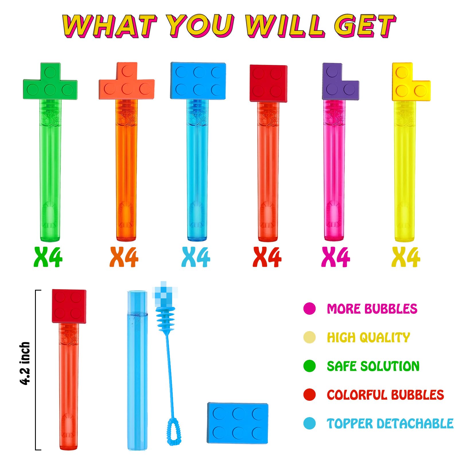 - Q: What are the main features of the Building Blocks Bubble Wands? A: The Building Blocks Bubble Wands set includes 24 colorful mini bubble wands in 6 different colors, each featuring unique building blocks patterns. The bubble wands are designed to be fun and safe for kids, filled with high-quality bubble soap liquid that creates a multitude of bubbles.