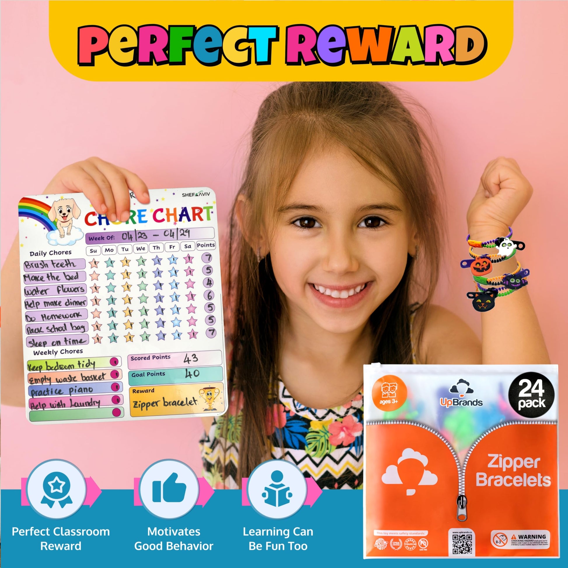 UpBrands Halloween Party Favor For Kids Zipper Bracelets Bulk Set, Kit for Birthday, Goodie Bags & Pinata Filler, Halloween Basket Stuffers, Fidget Toys, Sensory Friendship Teal Pumpkin Treats You will find in your UpBrands Trick or Treat Toys Zipper Bracelet Pack, 24 plastic zipper bracelets consisting of two different mixes of 2 bright and vivid colors as below: Twelve ORANGE-BLACK bracelets with GREEN clasps and PURPLE zipper puller Twelve PURPLE-GREEN bracelets with ORANGE clasps and BLACK zipper puller Each Zipper Bracelet have one of the four Halloween symbols as a rubber pendant attached: ORANGE Pumpkin WHITE Ghost BLACK Cat BLACK & PURPLE Bat