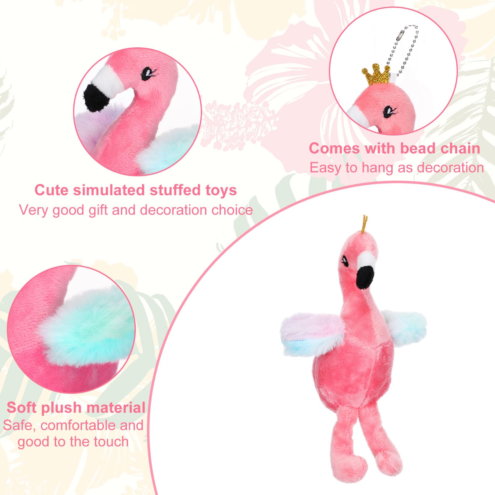 Features: It adds a patch of color and funk to your possessions while ensuring you never lose your essential keys. This flamingo plush toy has the potential to be a memorable gift during Christmas, New Year, birthdays, or any festival, helping you convey your feelings and add to the festivity. Open the door to a world of cute, comforting, and colorful fun with our flamingo stuffed animal. Made from quality plush material in a vivacious shade of pink, it promises both durability and a soft, snuggly touch thatll make it difficult to put down. Charm your loved ones during their special moments with our adorable flamingo key chains. Specifications: Main material: plush Main color: pink Size: 5.91 inches/ 15 cm Package includes: 24 x Mini stuffed flamingos Notes: Manual measurement, please allow slight errors on size. The color may exist a slight difference due to different screen displays. Not suitable for people younger than 12.